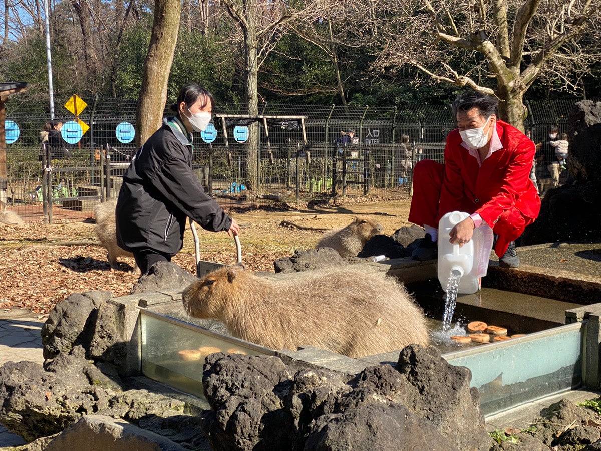 玉川温泉から車で15分の埼玉県こども動物自然公園では、毎年寒い時期限定で温めたお湯を使用したカピバラのお風呂「カピバラ温泉」を実施しています。そこに玉川温泉の源泉を運び、カピバラたちにプレゼントします。