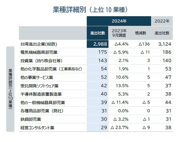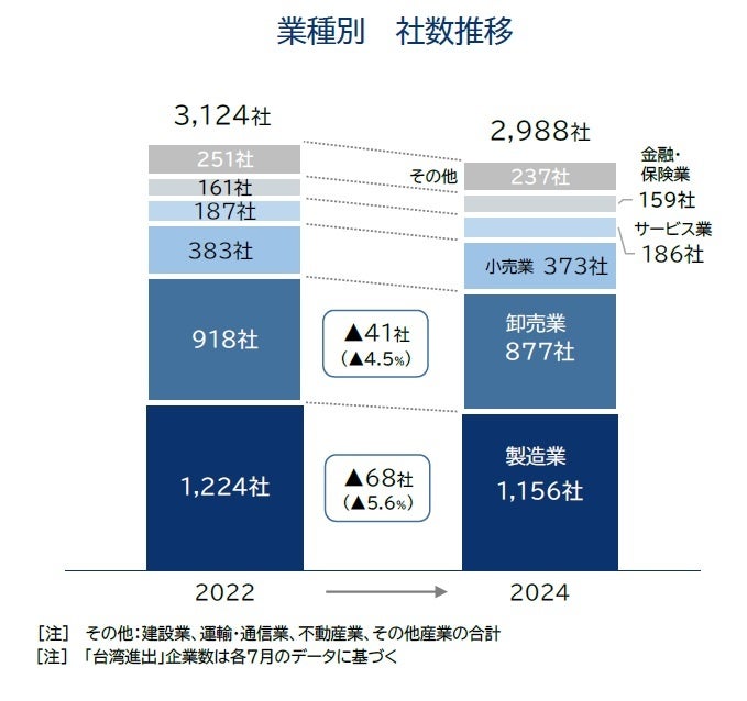 日本企業の台湾進出、2024年は2988社 2年前から136社・4.4%減