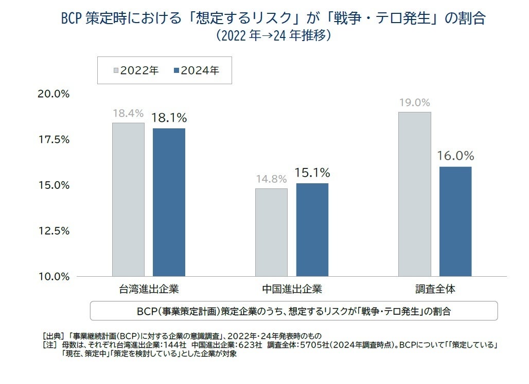 他方で、こうした台湾情勢や中国情勢の悪化に対する日本企業の備えは、十分とは言い難い状況が続いている。2022年と24年の調査データを基に、台湾・中国それぞれに進出している企業のBCP(事業継続計画)の策定動向について分析した。その結果、事業が中断する想定リスクのうち国家間の武力衝突や紛争など「戦争・テロ」をあげた企業の割合は、2024年調査で台湾進出企業のうち18.1%、中国進出企業で15.1%だった。全国平均(調査全体)の16.0%に比べると、台湾進出企業の同割合は高い水準となっているものの、22年に比べると僅かに低下するなど、有事を含めた危機対応に課題を抱える企業は少なくないとみられる。
