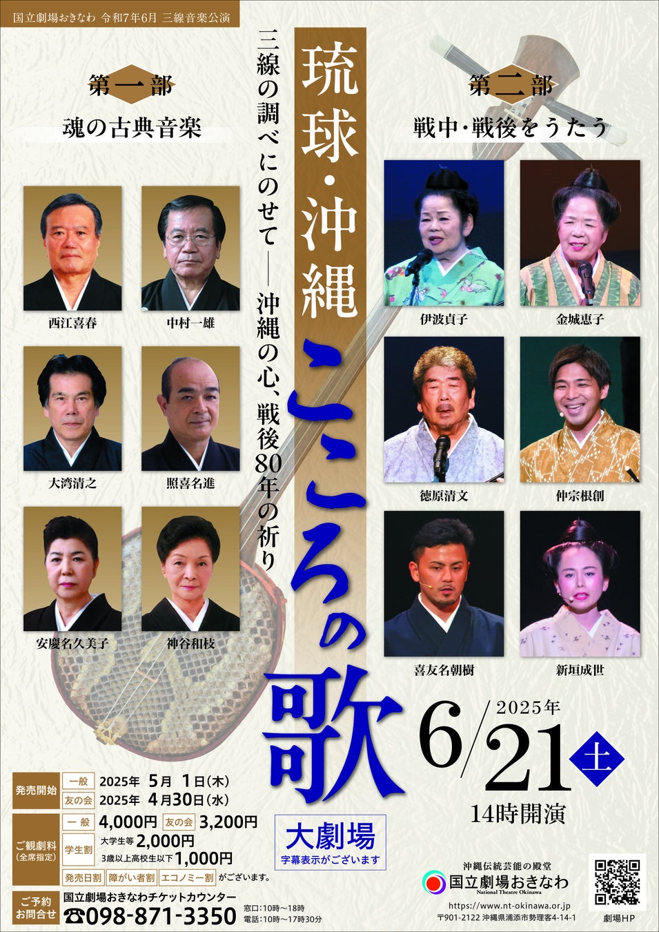 戦後80年の慰霊の日を前に、琉球・沖縄の音楽で、ウチナーンチュの心を伝える三線音楽公演。第一部は大昔節の斉唱と人間国宝二名による独唱を、第二部は戦中・戦後をうたった流行歌の数々をお届けいたします。