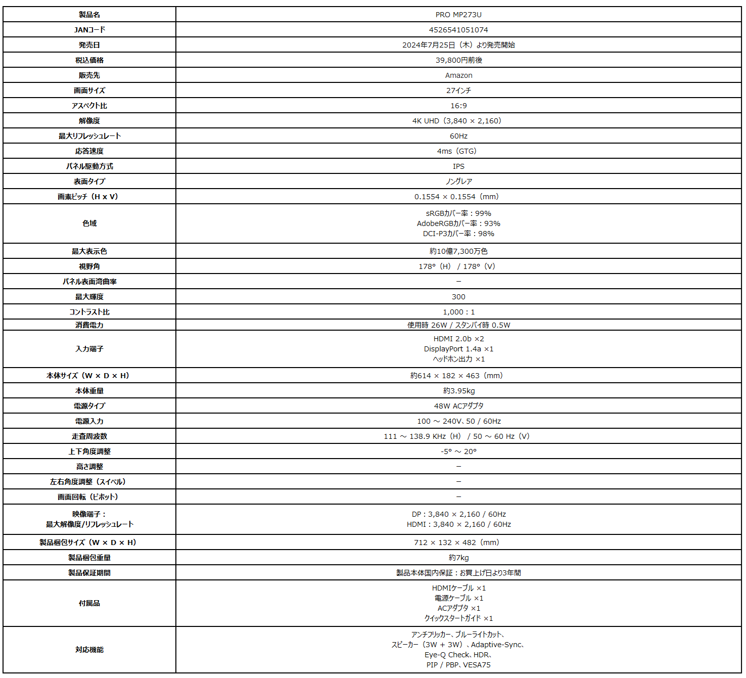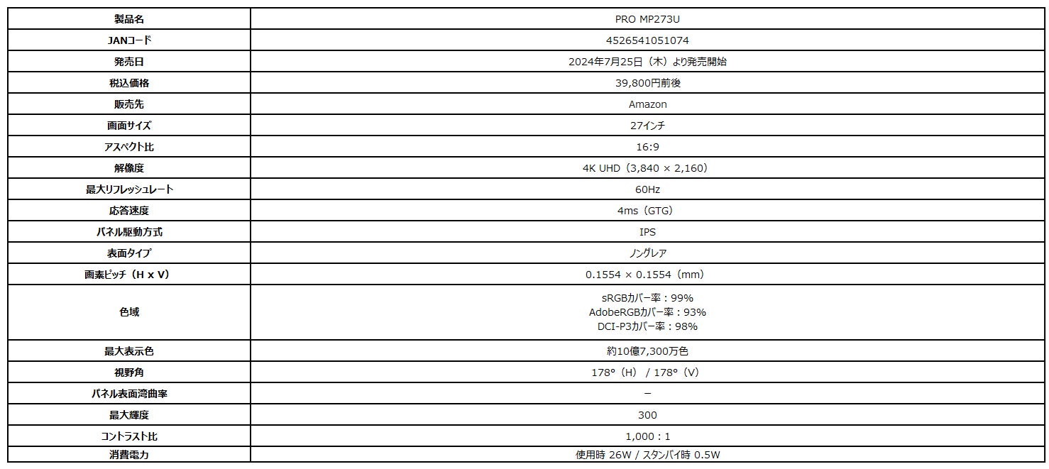 目に優しい機能を豊富に搭載しビジネスに最適な27インチ・4Kモニター広色域表示対応のIPSパネル搭載でクリエイターにもお勧め「PRO MP273U」発売