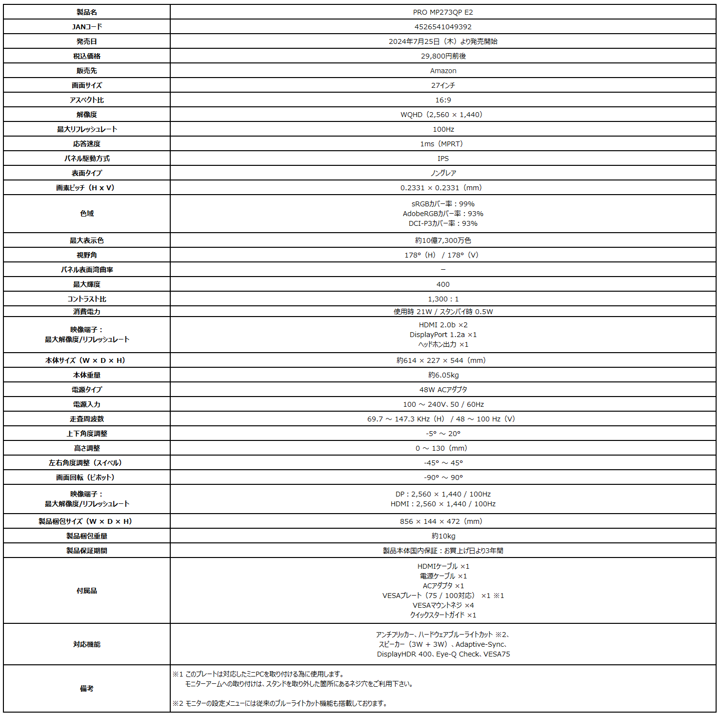 また、同日、近年人気が高まっている27インチサイズ、WQHD解像度、リフレッシュレート100Hz、高画質IPSパネルと高性能スタンド、色の変化を抑えたハードウェアブルーライトカット機能を搭載し、ビジネスシーンにお勧めな「PRO MP273QP E2」が新たにラインナップに加わります。