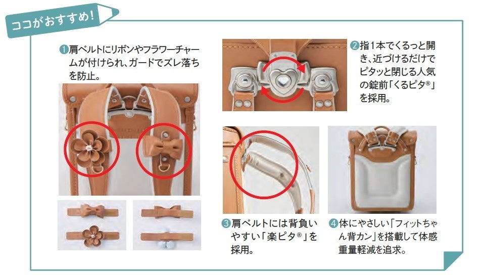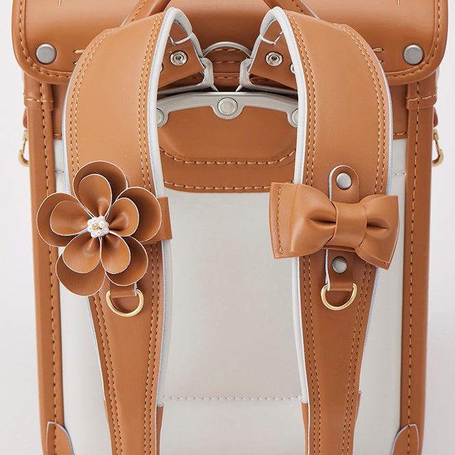 ランドセルと同色の「フラワー」と「リボン」モチーフのチャームがセットになった人気モデルのランドセル。肩ベルトにリボンやフラワーチャームが付けられます。チャームは簡単に付け替え可能、人気機能の「くるピタ®」(指1本でくるっと開き、近づけるだけでピタッと閉じる錠前)、肩ベルトには背負いやすい「楽ピタ®」を採用するなど、このたびバージョンアップしました。