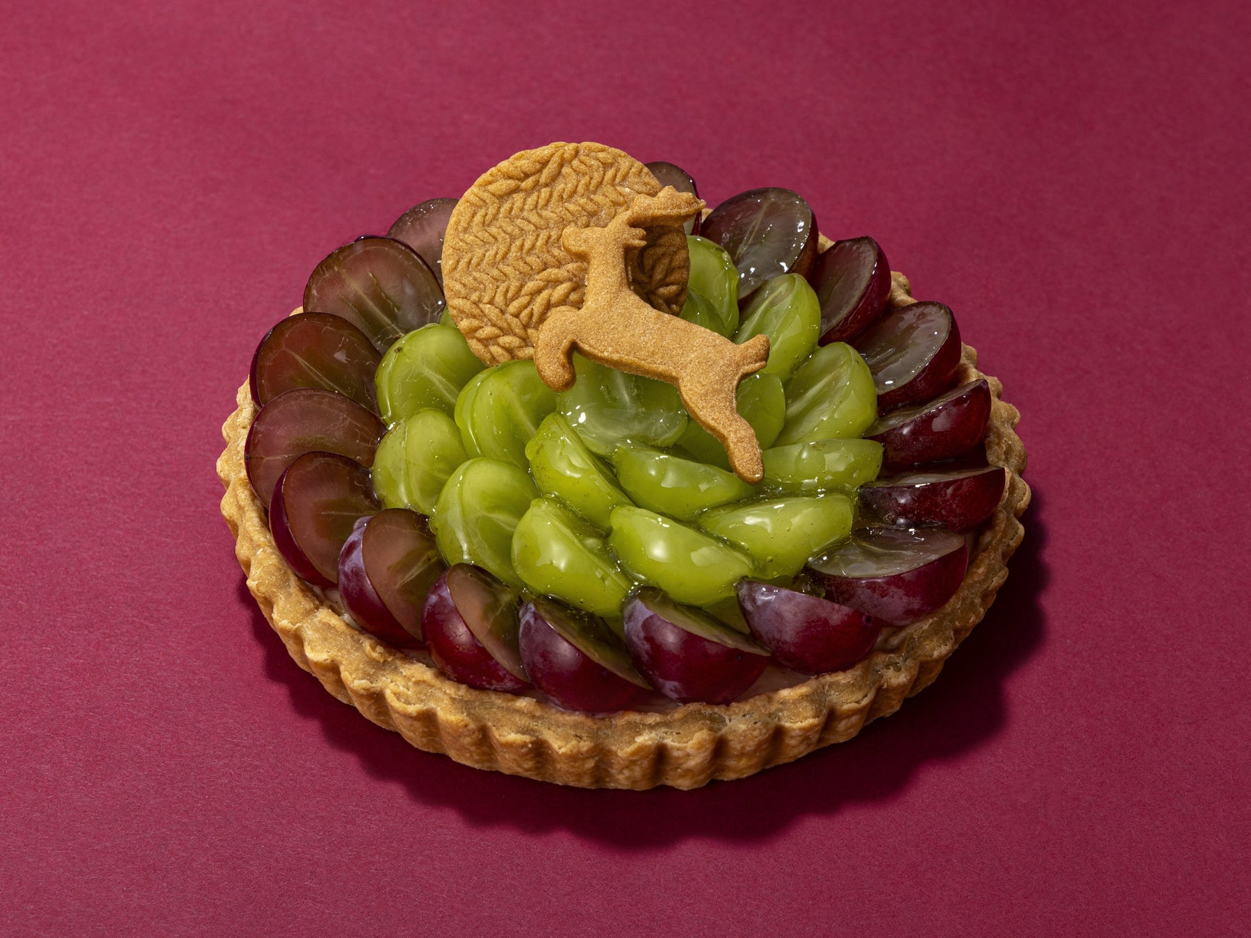 山形県・鶴岡の「カラフルぶどう園」から直接届く、巨峰よりも糖度が高い希少品種〈オリエンタルスター〉を贅沢に使用。通常は8〜10月が旬のブドウを、特別な低温保存でクリスマスまで大切に守り抜き、芳醇な甘みとジューシーな味わいを実現しました。さらにシャインマスカットを組み合わせ、ひと粒ごとに上品な香りと弾ける果汁感を楽しめます。艶やかな果実をふんだんに飾ったタルトは、見た目も華やかで、クリスマスの夜にふさわしい珠玉のひと品です。