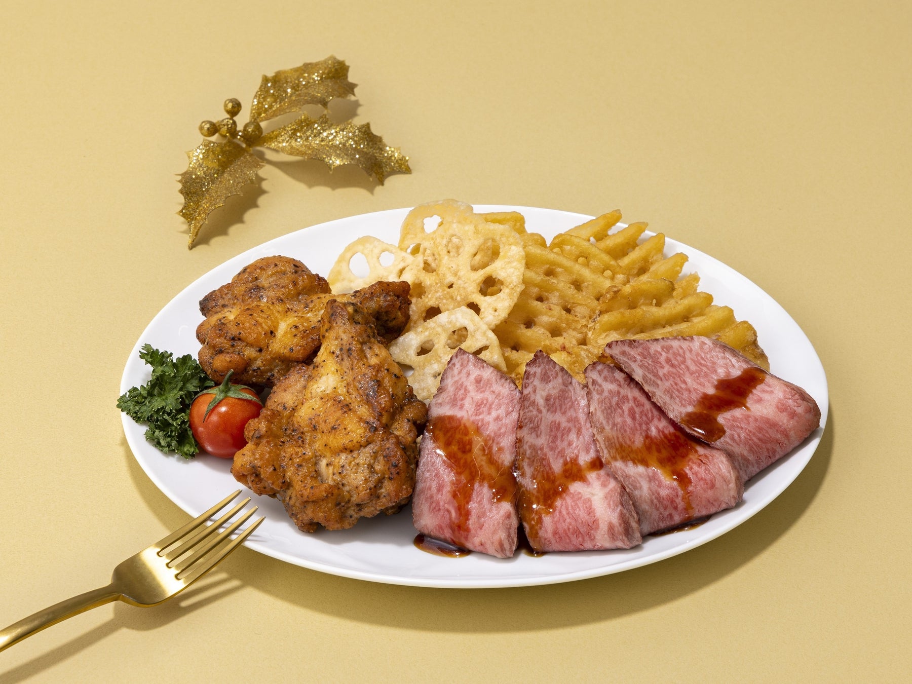 低温でじっくりと焼き上げた黒毛和牛上カルビ肉のステーキ仕立てと、黒胡椒を効かせた手羽揚げのセットです。