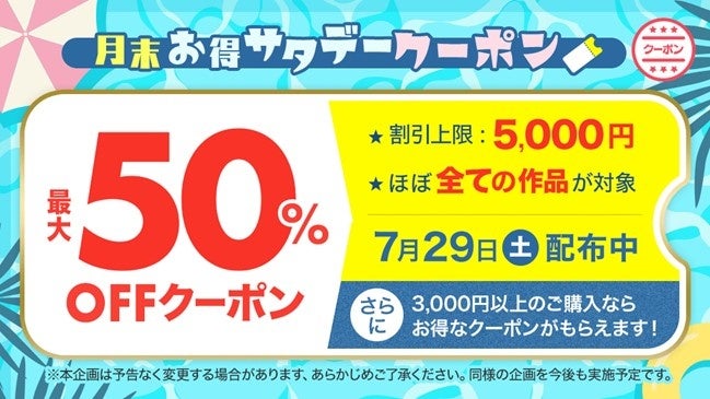 電子書籍販売サイト「ebookjapan」をヤフー株式会社と協力して運営する株式会社イーブックイニシアティブジャパンは、「ebookjapan」で50%OFFクーポンがもらえる「月末お得サタデー」を7月29日(土)に実施します(上限5,000円、1人1回)。この機会に、気になっていたマンガをぜひお楽しみください。