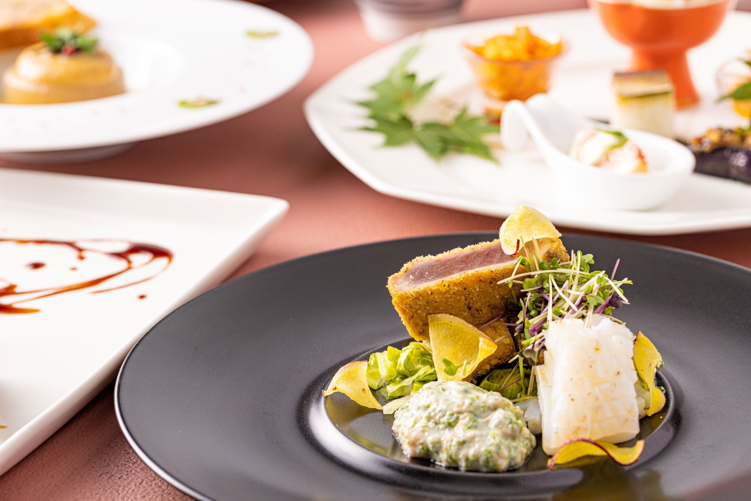 戻り鰹の瞬間揚げとあおりイカのグリル