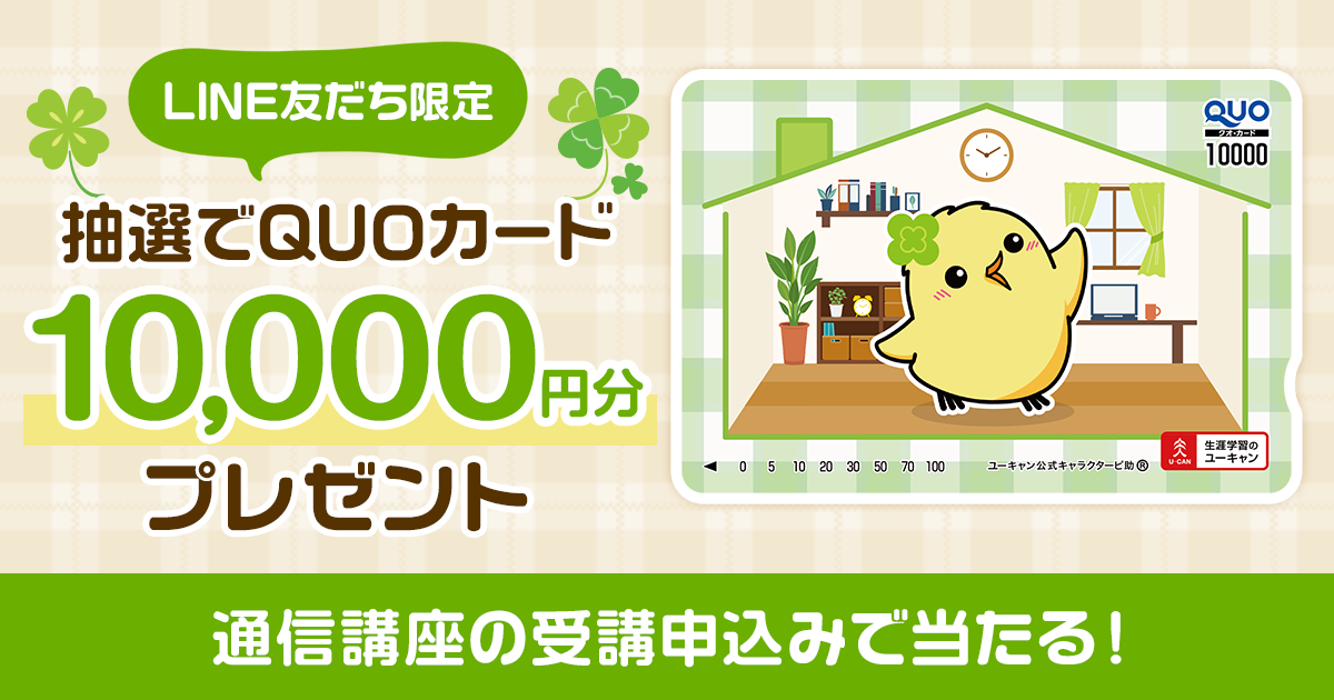 ユーキャンのLINE公式アカウントを友だち追加し、キャンペーンページを経由して通信講座の受講申込みをしていただいた方の中から抽選で5名様に、ユーキャン特製のQUOカード10,000円分を差し上げます。