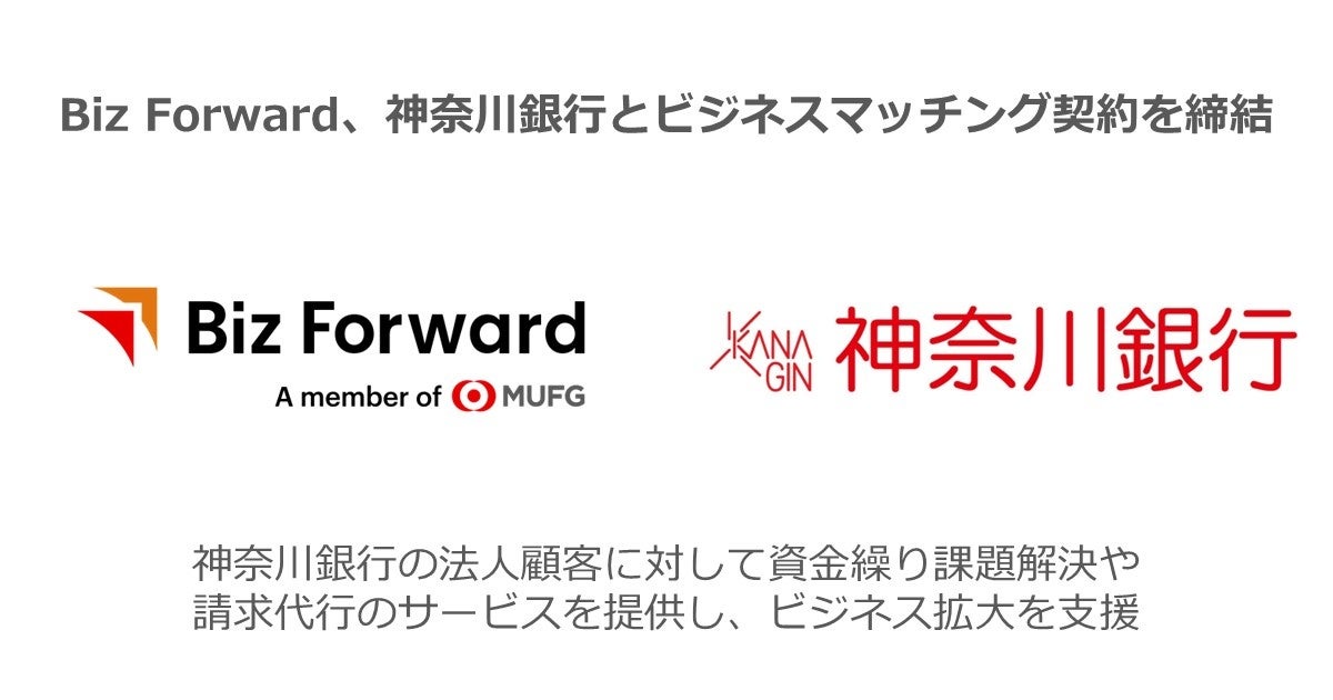 株式会社Biz Forwardは、株式会社神奈川銀行とビジネスマッチング契約を締結しました。本契約により、神奈川銀行の法人顧客に対して、中小企業向けオンライン型ファクタリングサービス『SHIKIN+』とクラウド型BtoB請求代行サービス『SEIKYU+』の提案・提供が可能になります。