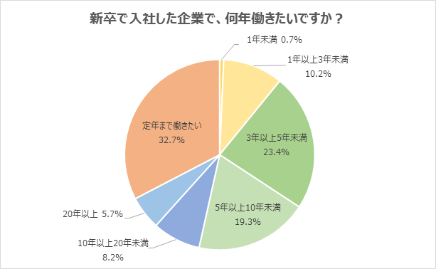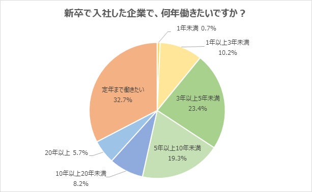 新卒で入社した企業で働きたい年数は「定年まで」が最多。次いで「3年以上5年未満」。「長く働いて貢献したい」の声とともに、「キャリアアップのためには転職も1つの手段」の声が上がる/新社会人アンケート
