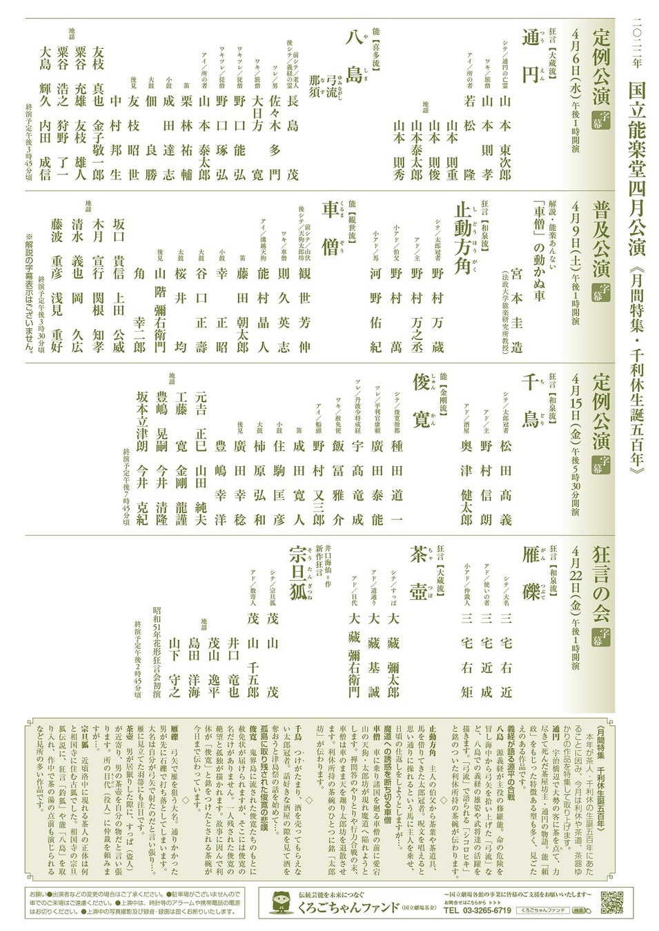 千利休生誕500年記念 国立能楽堂4月公演 演目決定 カンフェティでチケット発売
