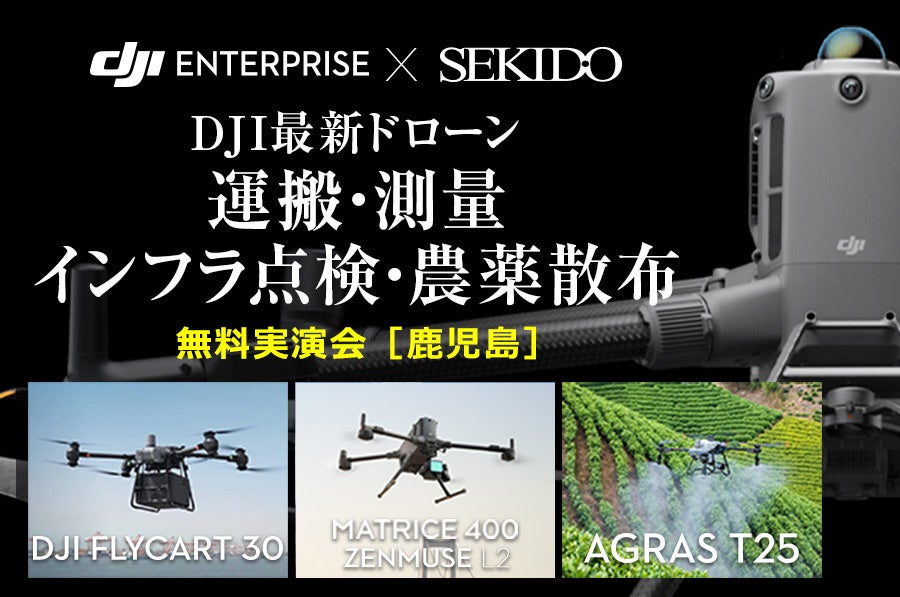 DJI(ディージェイアイ)正規販売代理店としてドローンビジネスの最前線を支える株式会社セキド(本社:東京都港区、代表取締役:⼤下貴之)は、セキド福岡(運営:株式会社レイメイセキド)と共催で、2025年8月27日(水)に鹿児島県南さつま市にて最新ドローンの無料実演会を開催します。