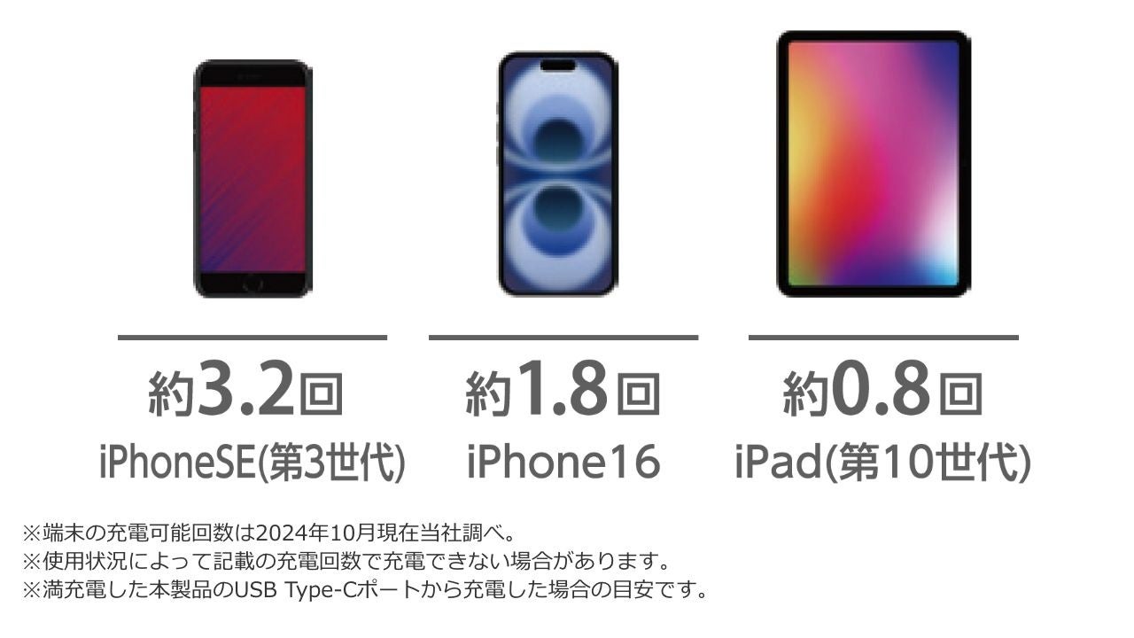 ※満充電した本製品で電源オフの状態のスマートフォンを充電する際の目安回数です。充電中に電源を入れたり、機器を使用したりしている場合は記載の数値まで充電できない場合があります。