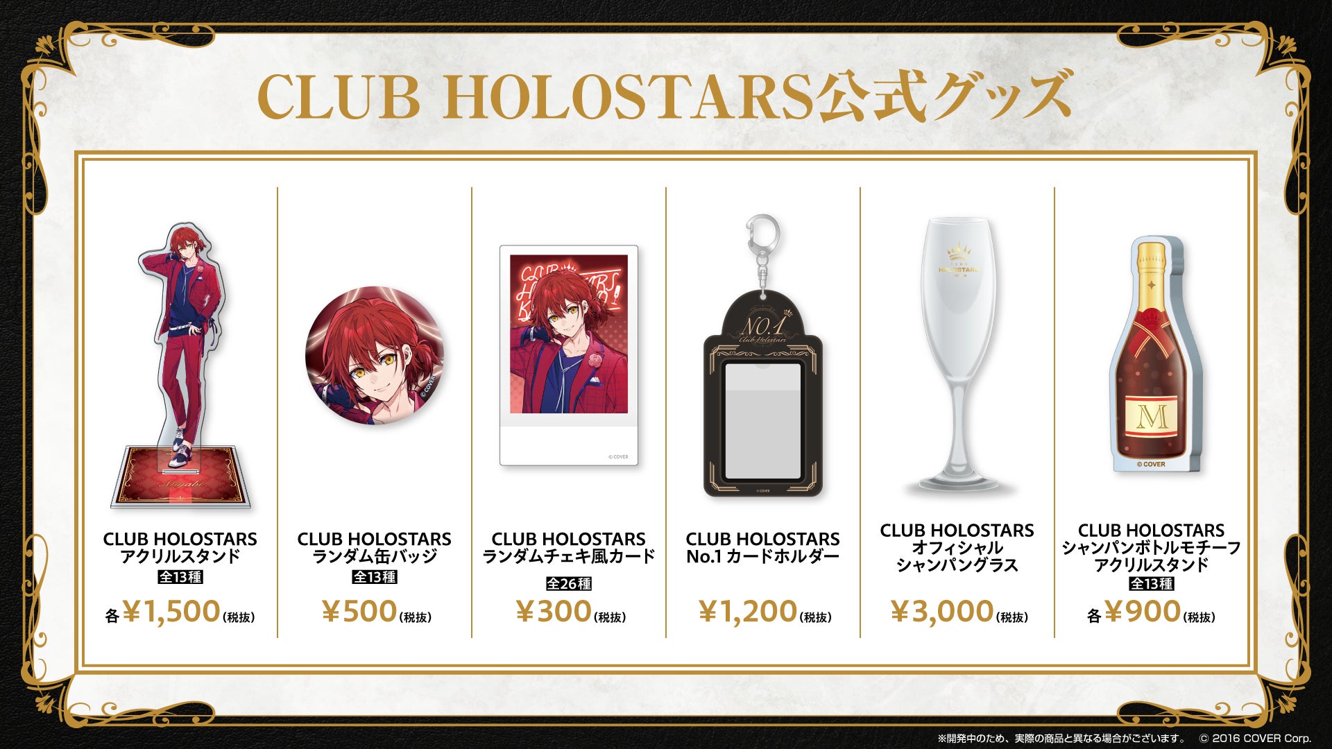 また、「CLUB HOLOSTARS オリジナルシャンパングラス」や、各タレントをイメージした「シャンパンボトルモチーフアクリルスタンド」は、キービジュアル内でタレントが持っているものと同じグッズとなります。