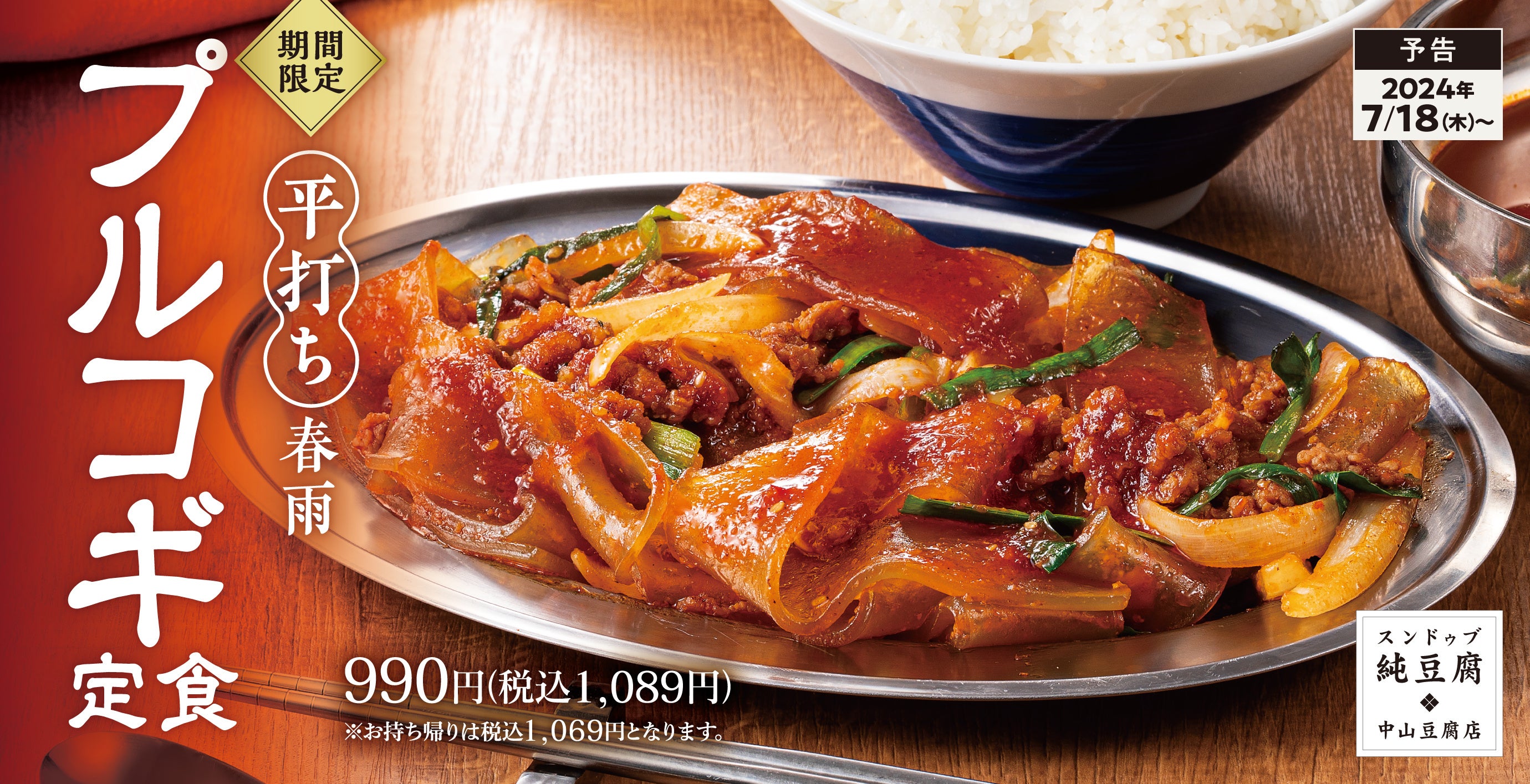 酷暑日や猛暑日で食事の選択肢に迷う方に向けて、スンドゥブ定食専門店「スンドゥブ 中山豆腐店」は、旨辛仕立てでご飯がすすむ「平打ち春雨プルコギ定食」を2024年7月18日(木)より期間限定で販売を開始いたします。