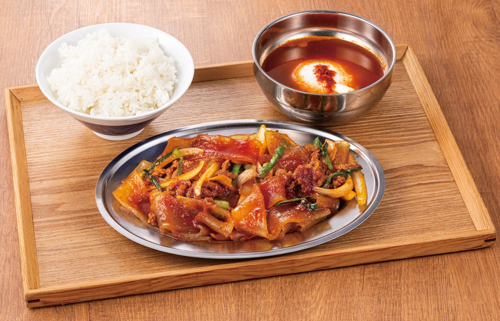 プルコギといえば想起する牛肉や玉ねぎとニラ、もちもち食感の平打ち春雨を旨辛ダレで香ばしく炒め、白米が恋しくなり見た目を超える食べ応えに満足していただきたいと考え誕生した定食です。