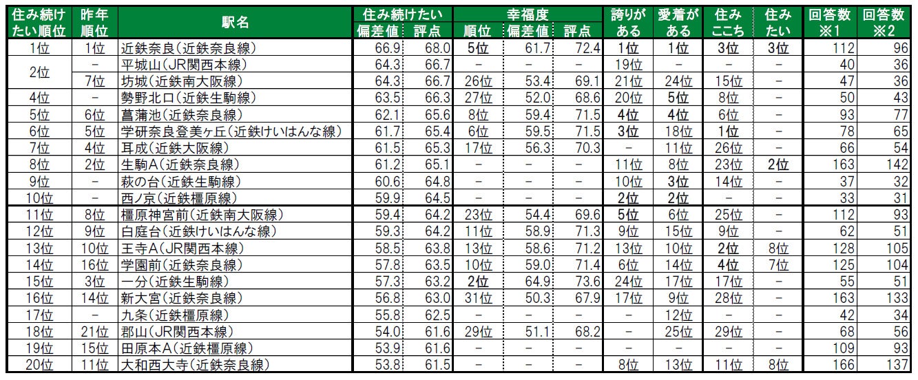 1位は2年連続で、奈良市に位置する近鉄奈良です。同駅は、「街に誇りがある」「街に愛着がある」の両ランキングでも1位、「住みここち」「住みたい街」3位、「街の幸福度」5位と、全てのランキングでトップ5に入る高い評価を得ています。2位は奈良市に位置する平城山で、昨年は累計回答数が30名未満だったためランキング集計対象外だった駅です。同率2位の坊城は橿原市に位置する駅で、昨年7位から順位を上げました。