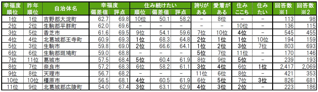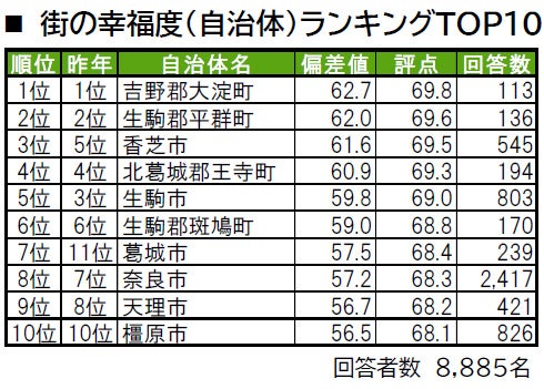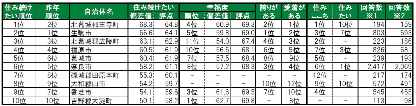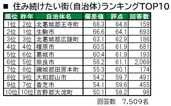 ●トップ10のうち4自治体が郡部の町(吉野郡大淀町・生駒郡平群町・北葛城郡王寺町・生駒郡斑鳩町)です。 ●トップ10のうち、8自治体が「住みここち」でもトップ10に入っている自治体です。