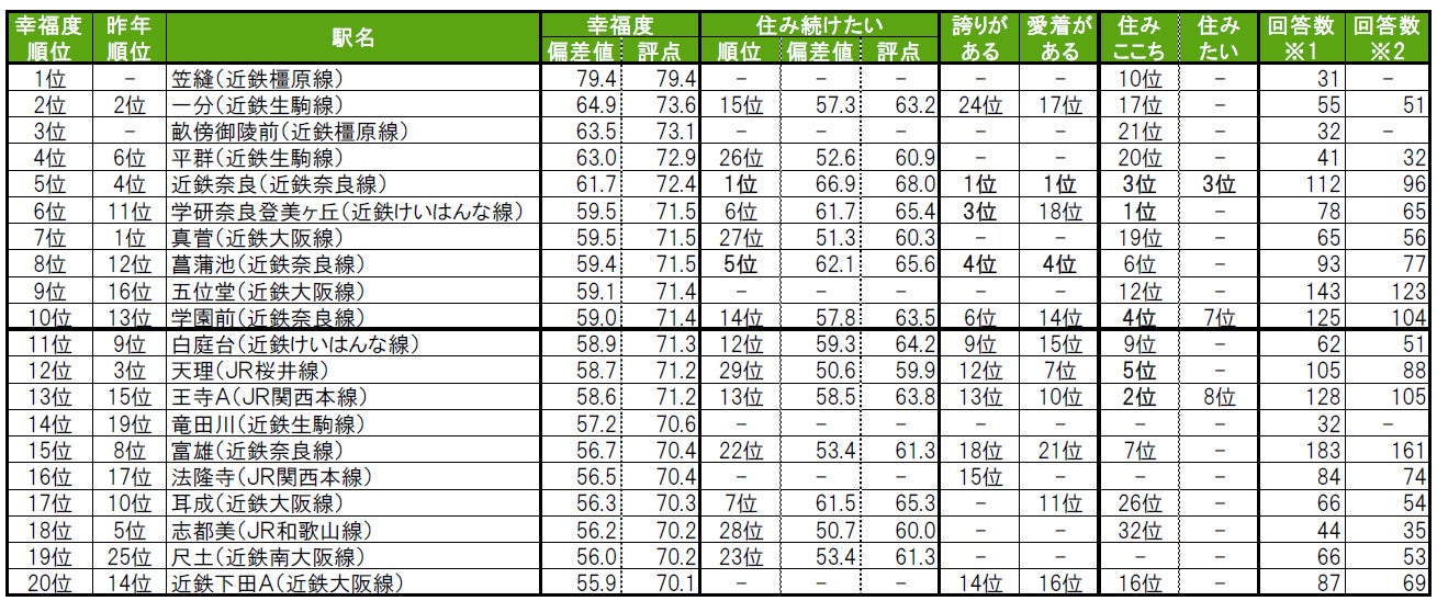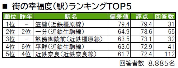 1位は磯城郡田原本町に位置する笠縫で、唯一偏差値70台の高い評価を得ています。2位は「街の幸福度(自治体)」で5位の生駒市に位置する一分です。3位は、橿原市に位置する畝傍御陵前です。1位の笠縫と3位の畝傍御陵前駅は、昨年は累計回答数が30名未満だったためランキング集計対象外でした。