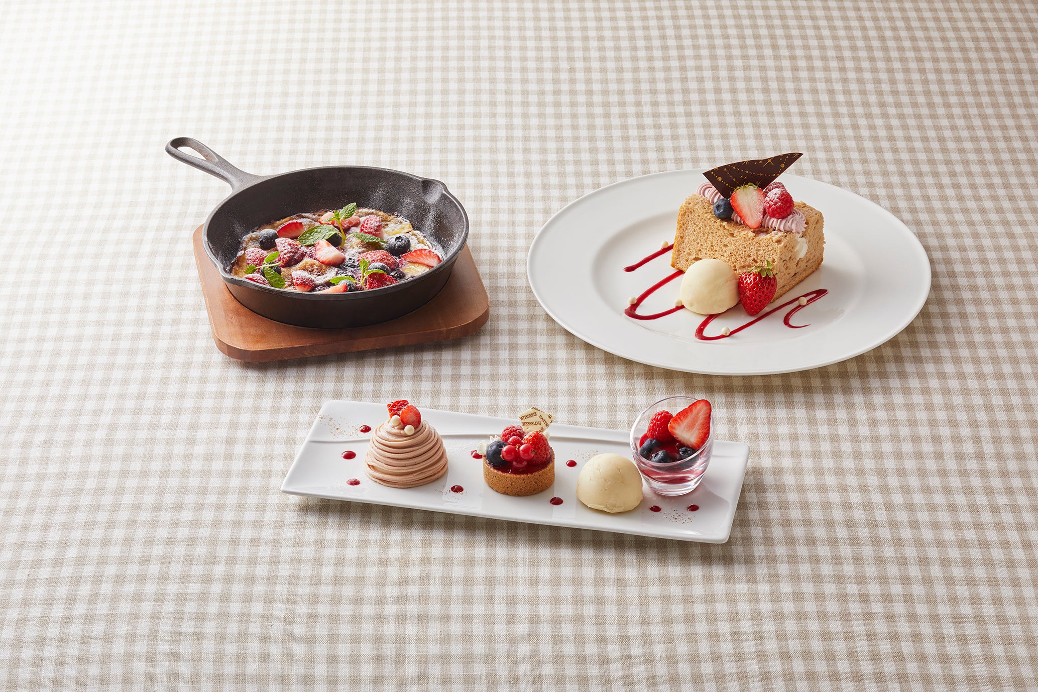 温かいスイーツのベリーのクラフティは、甘酸っぱいベリーと優しい甘みの生地がベストマッチ。また、ほんのりとラズベリーが香る、ふんわり軽い食感のシフォンケーキは、生クリームとラズベリークリームをサンドし、バニラアイスやイチゴを添えました。