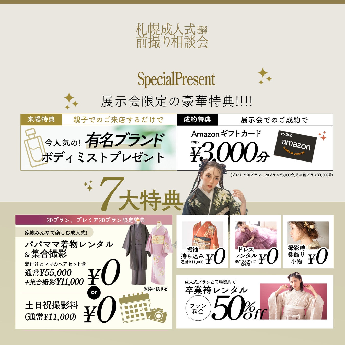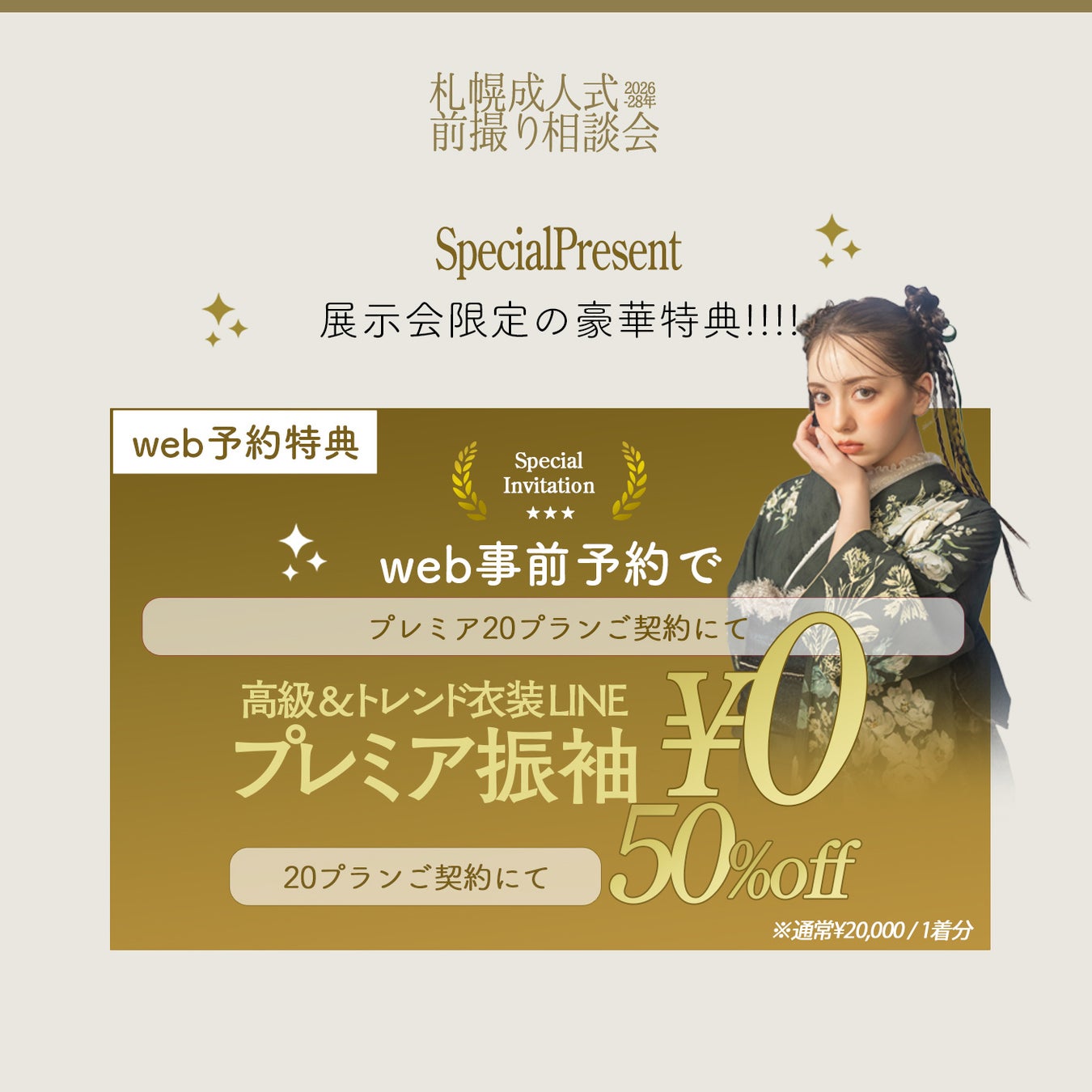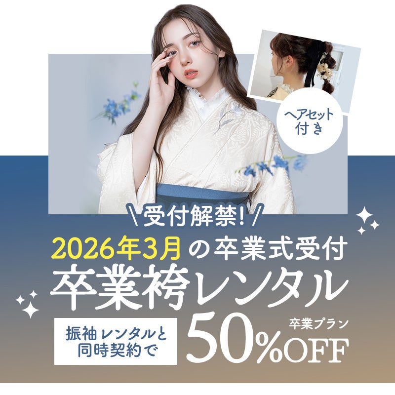 4月1日より受付開始!2026年3月の卒業袴レンタル。今回の展示会では、成人式プランと同時契約いただくと卒業式プランが50%OFFとなります。