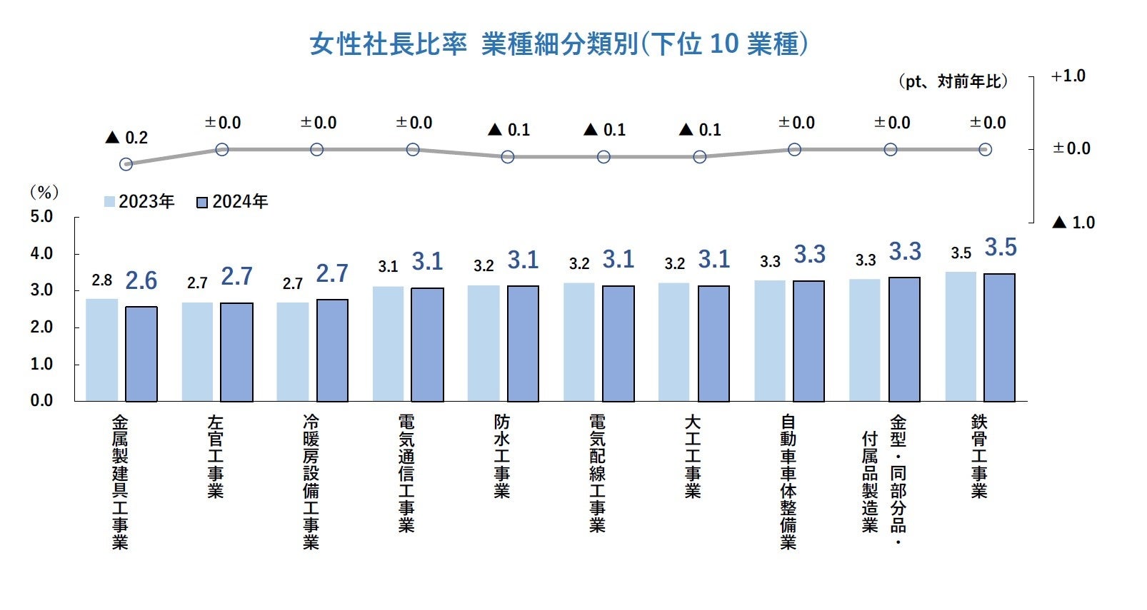 同様に業種細分類別で最も低かった10業種をみると、「金属製建具工事業」(2.6%)を筆頭に、10業種中8業種が建設業だった。他2業種は、サービス業の「自動車車体整備業」、製造業の「金型・同部分品・付属品製造業」(いずれも3.3%)だった。