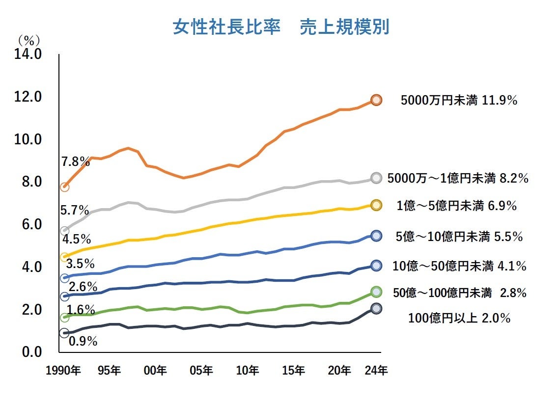 売上規模別の女性社長比率をみると、「5000万円未満」が11.9%となり最も高かった。1990年当時から、他区分と比較して高かったものの、2024年までの上昇幅(+4.1pt)も最も大きかった。特に2010年以降は、大幅な上昇がみられた。