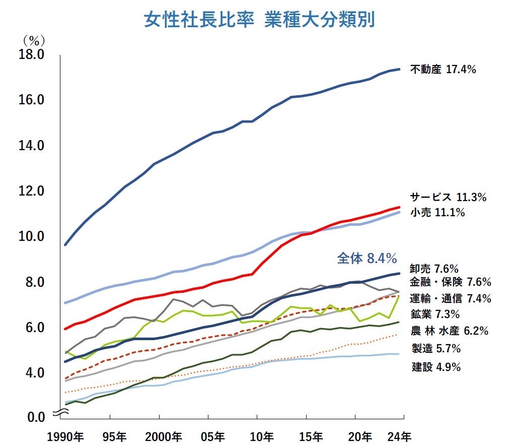 業種別に女性社長の比率をみると、「不動産」が17.4%でトップだった。続く「サービス」(11.3%)や「小売」(11.1%)といった「BtoC」業種を大きく引き離し、群を抜いて高い水準が続いている。