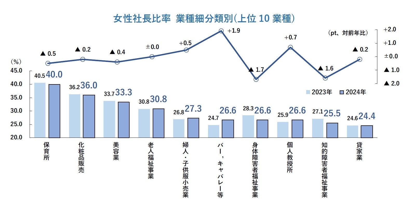 業種細分類別でみると、「保育所」が40.0%で最も高かった。唯一4割を超えたものの、前年から0.5pt低下した。次いで「化粧品販売」(36.0%)、「美容業」(33.3%)といった美容関連業種や、「老人福祉事業」(30.8%)、「身体障害者福祉事業」(26.6%)、「知的障害者福祉事業」(25.5%)といった社会福祉関連が続いた。