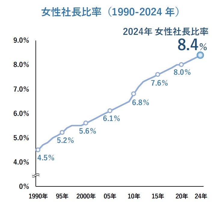 帝国データバンクでは、国内企業の女性社長比率について調査を実施した。2024年10月時点で8.4%となり、前年の8.3%を上回り4年連続で上昇を続け、過去最高を更新した。統計として遡れる1990年(4.5%)から上昇を続けているものの、そのスピードは緩やかで1ケタ台にとどまっている。