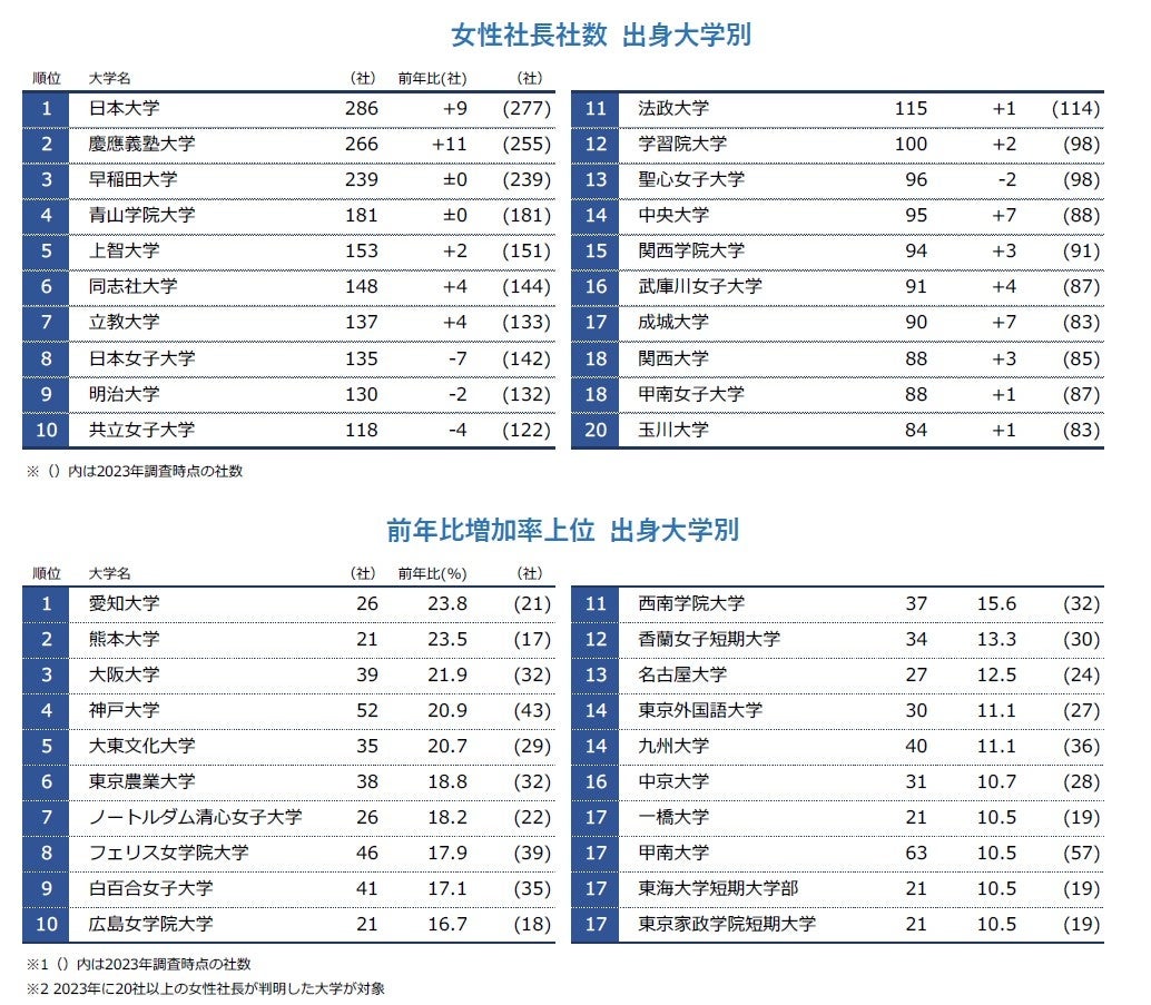 女性社長の出身大学別では、6年連続で増加している「日本大学」が前年比9社増の286社でトップだった。2020年に当時最多だった「慶應義塾大学」を上回って以降、5年連続でトップとなった。次いで「慶應義塾大学」(266社、前年比11社増)がトップから20社差で続き、「早稲田大学」(239社、同横ばい)も含め上位3大学が200社を超え、それぞれ過去最高の女性社長数だった。その他、「青山学院大学」(181社、同横ばい)や「上智大学」(153社、同2社増)など9校が100社台で続いた。また、女子大学としては「日本女子大学」(135社、同7社減)がトップとなったもののピークから8年連続で減少する結果となった。