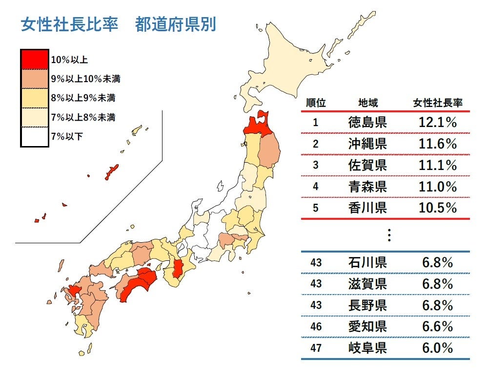 都道府県別では「徳島県」が12.1%で最も高かった。前年から0.1pt上昇し3年連続のトップとなった。徳島県を中心に、四国地方では3県が10%を上回っており、全国的にも女性社長割合の高さが目立っている。その他にも西日本エリアは高水準で、九州地方では「沖縄県」(11.6%)と「佐賀県」(11.1%)などで高かった。また、「青森県」は11.0%と全国4位となり、東北エリアのなかで唯一10%を超えた。