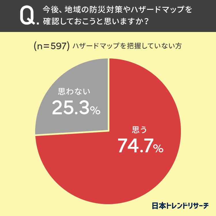 74.7%の方が、地域の防災対策やハザードマップを確認しておこうと「思う」と回答しています。