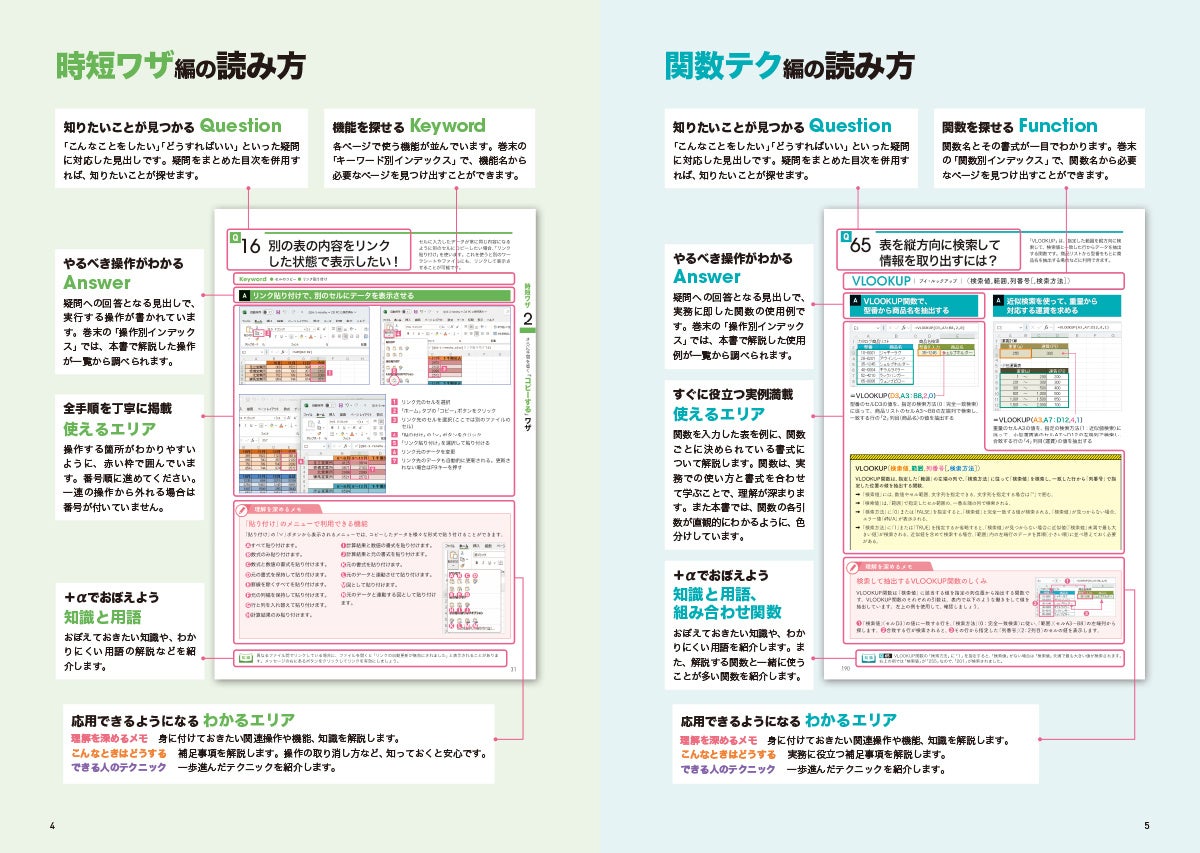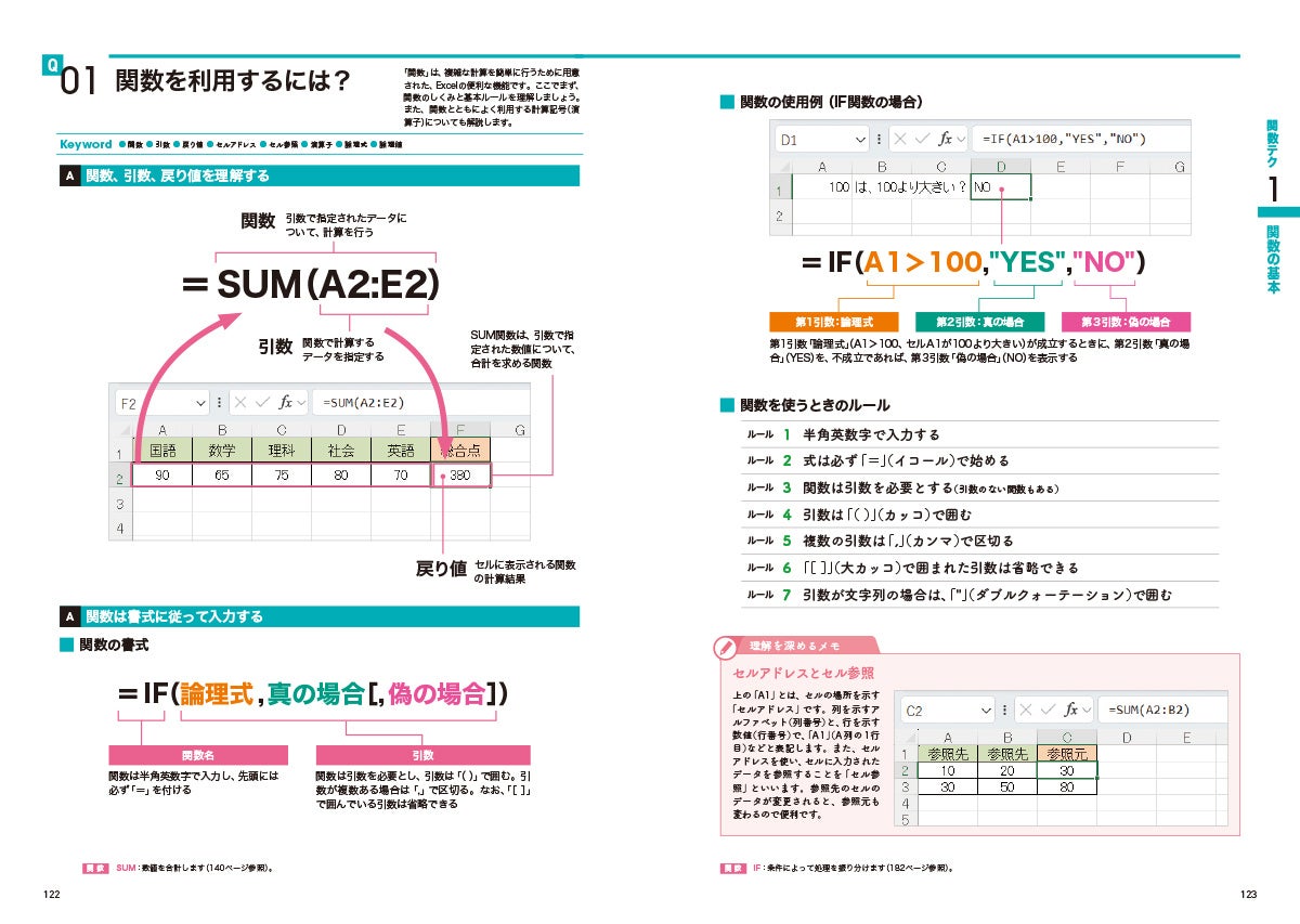また、「関数テク」編では、関数の書式をしっかりと解説しており、どの引数がどのような役目を果たしているのかも一目瞭然。単なる丸暗記ではなく、さまざまなケースに対応できるようになります。