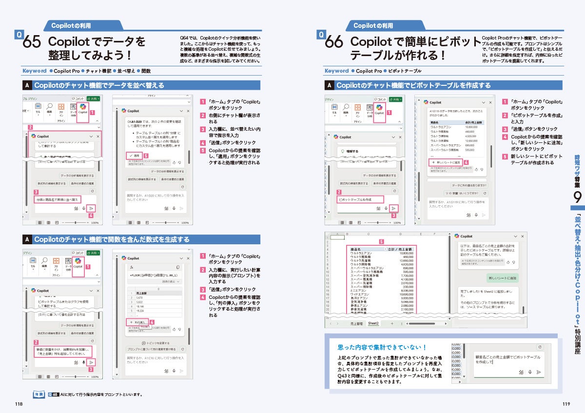 最新のOffice2024(およびMicrosoft 365)版に準拠して解説されており、最新のAI機能である「Copilot」の概要や簡単な使い方、比較的新しい機能である「スピル」の活用法などもしっかりと紹介。