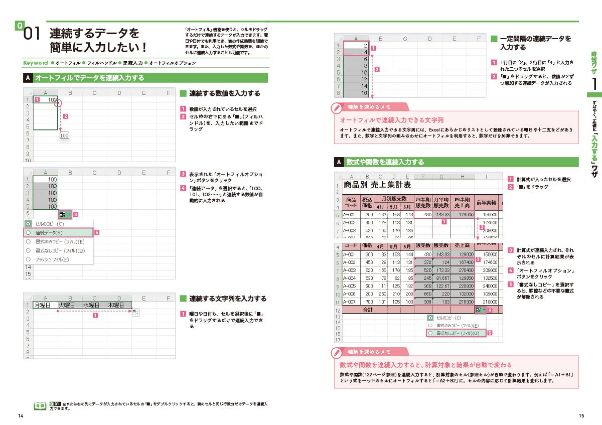 「時短ワザ」編では、オートフィルやキーボードショートカットなどを駆使した入力・選択・コピー方法や、表示形式を用いたわかりやすいデータ整理テクニックなどを紹介。さらに、グラフの作成方法や見やすく印刷する方法などもレクチャーします。