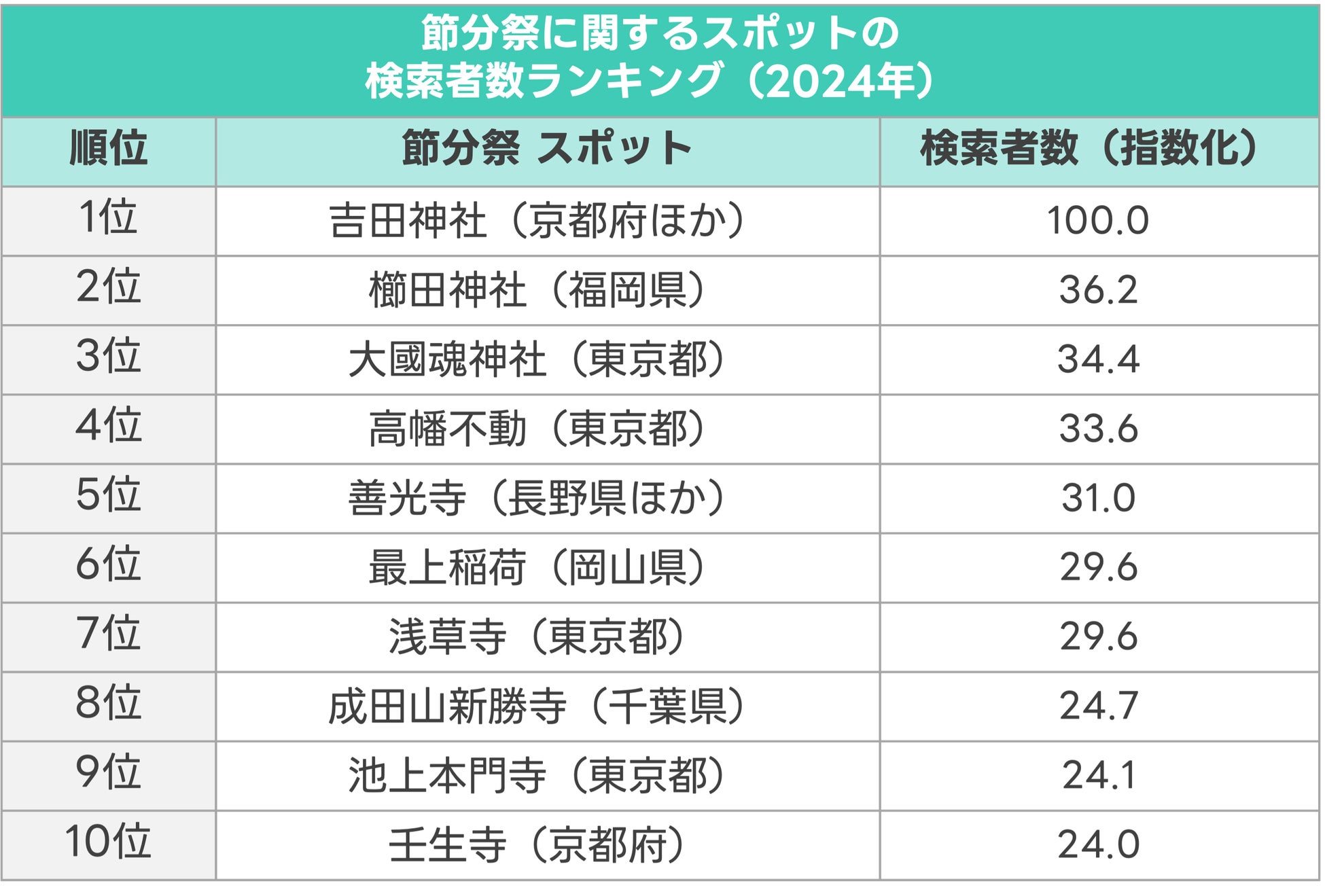 2024年の節分祭に関するスポットの検索者数ランキングは「吉田神社」が圧倒的