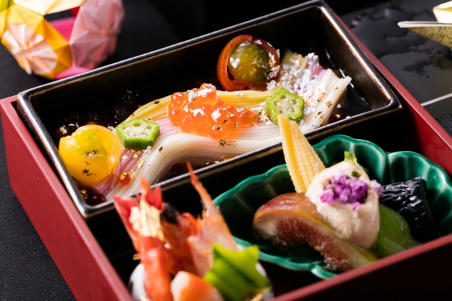 前菜には「短冊盛り」というネーミングで、陰陽五行説の陽「相生(そうせい)」より五色の短冊をイメージした5種類の料理を、また七夕の行事食である素麺は天の川のイメージで仕立てます。