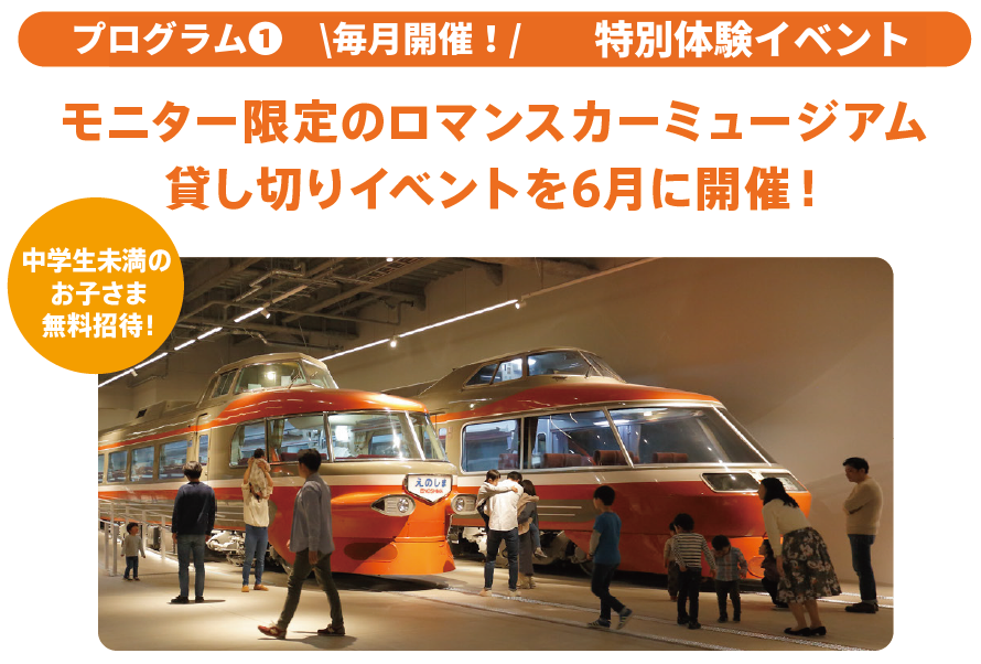 ロマンスカーミュージアムを営業時間外にモニター向けに貸し切って開催するイベントです。通常営業にはないスペシャルコンテンツをお楽しみいただけます。