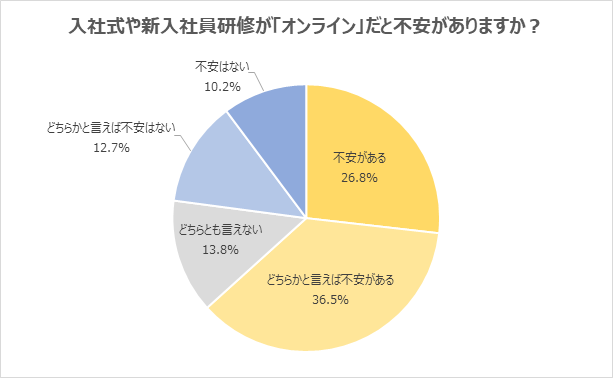 入社式や新入社員研修が「オンライン」だと「不安がある」「どちらかと言えば不安がある」と回答した新社会人が63.3%に上りました。「オンラインだと職場の雰囲気が分からない」「上司や先輩社員、同期との人間関係を築きにくいと思う」「先輩がどのような仕事をどのようなスケジュールで担っているか分からないと、質問や相談をするタイミングをつかみにくい」といった声が上がりました。上司や先輩社員、同期との信頼関係を築けないまま仕事をすることに不安を抱く新社会人が多いことが分かります。