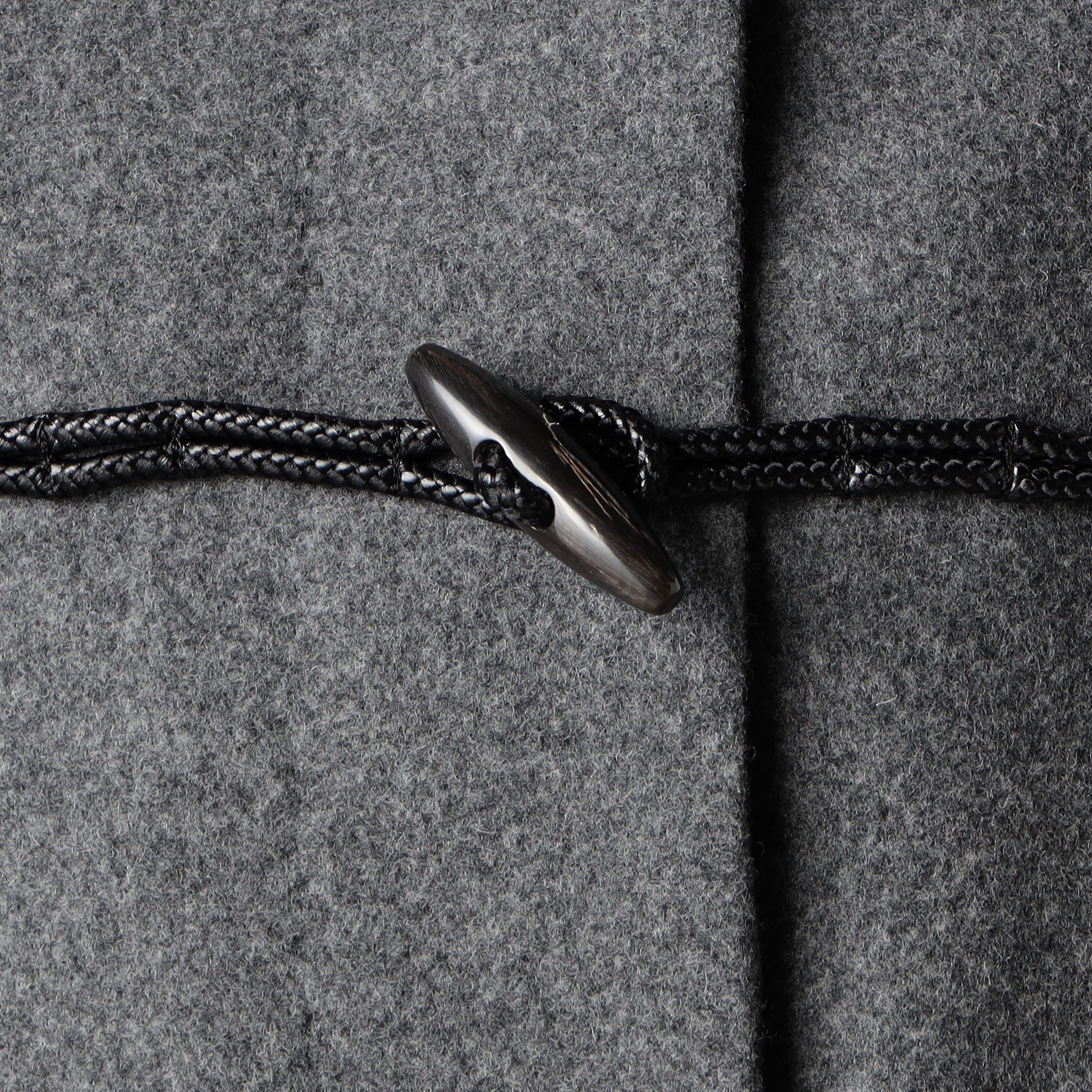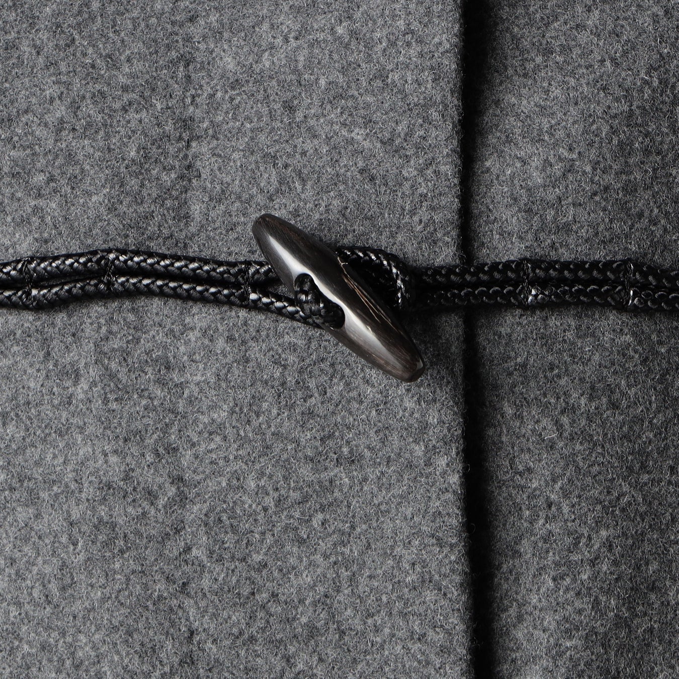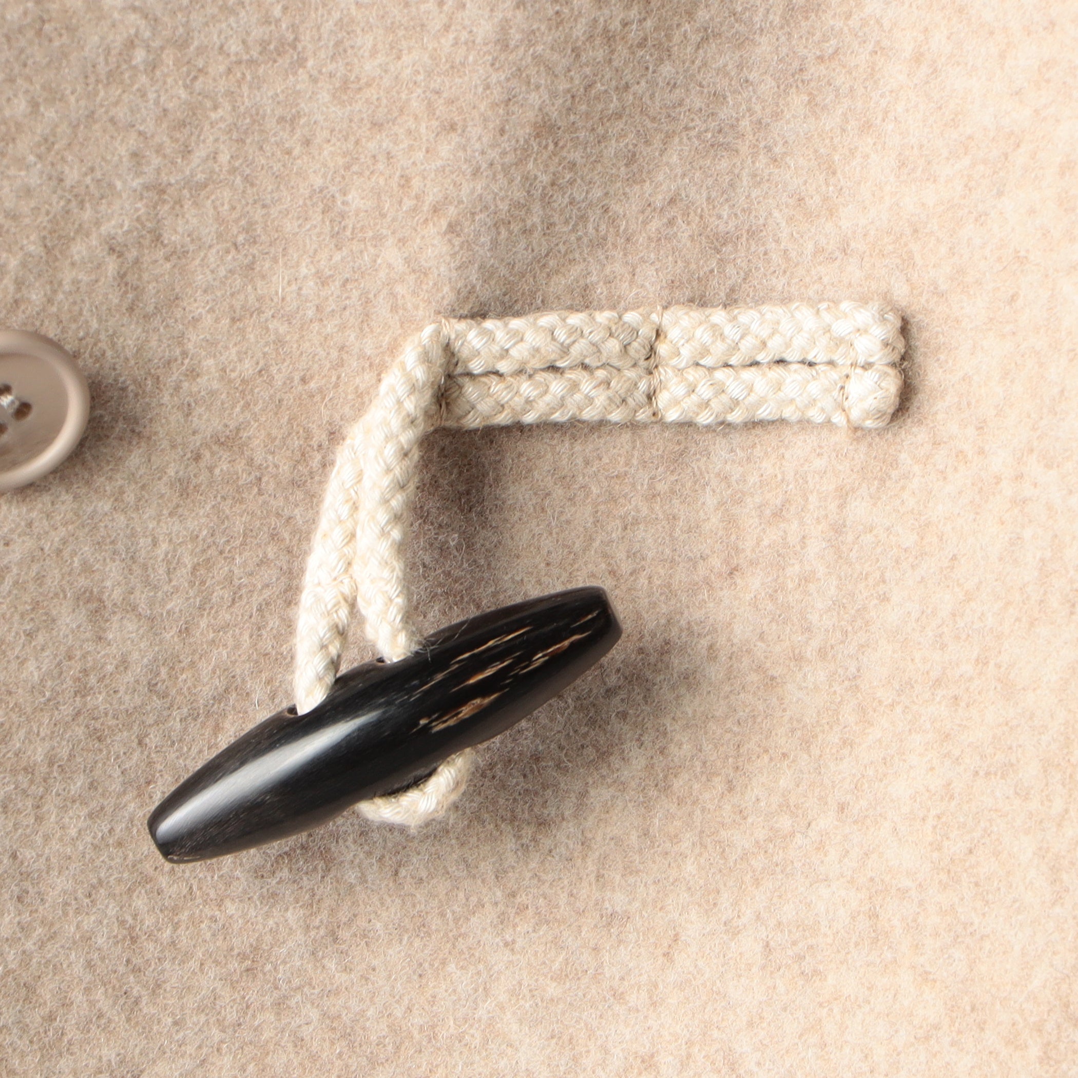 トグルボタンは高級感のある本水牛を使用しています。ベージュにはナチュラルな麻紐、グレーとブラックにはレザーのようなコーティングコードを使用して仕上げた、大人の本格ダッフルです。