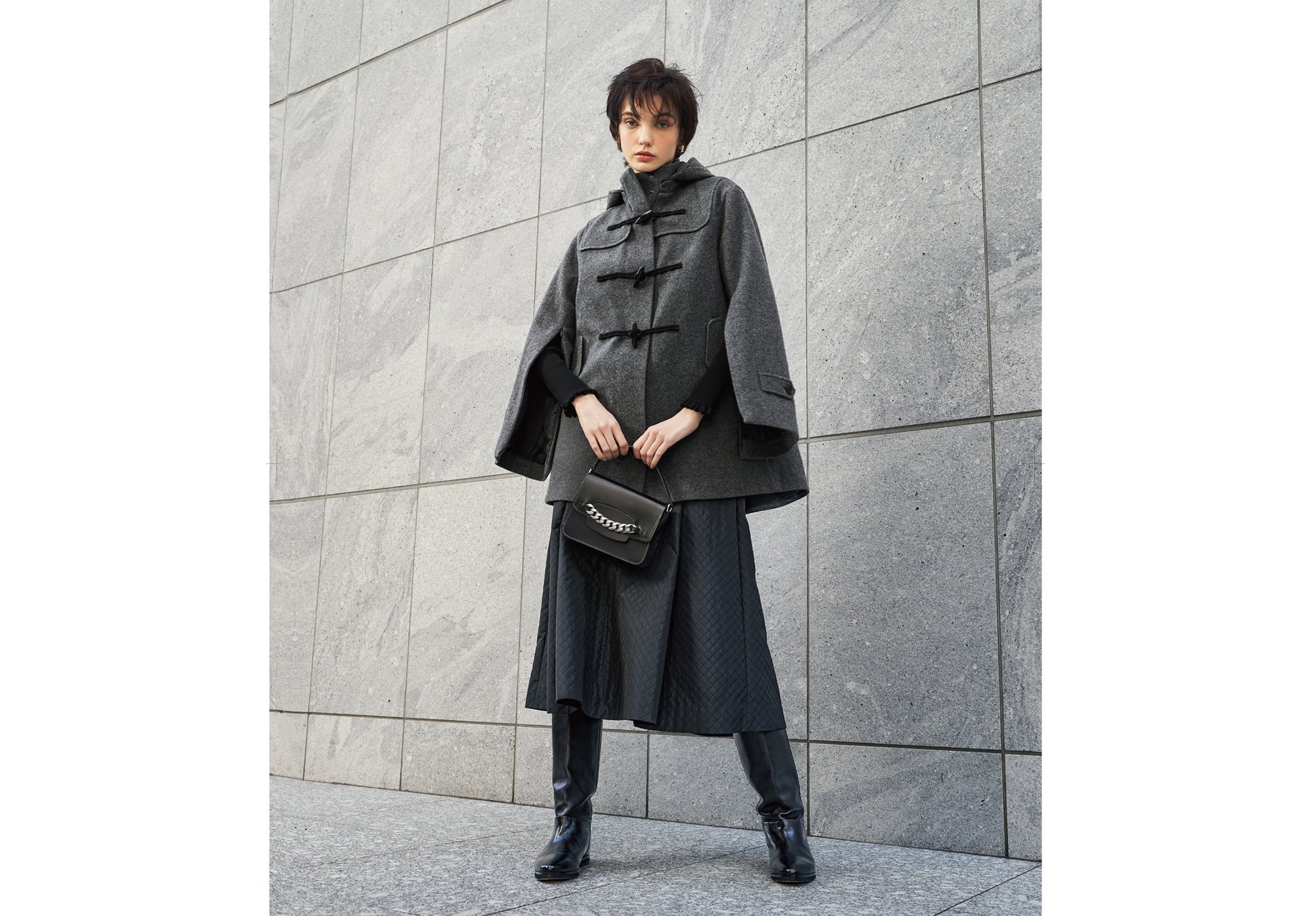 トラッドな印象の伝統的なダッフルコートのディテールを活かしながら、洗練された大人かわいい着こなしのコートをつくりたいと思い、袖をケープ風に、シルエットはAラインのショート丈にアレンジして、今年らしくフェミニンに進化させたコートを発売します。スタイリングに合わせて様々な着こなしを楽しめるデザインです。
