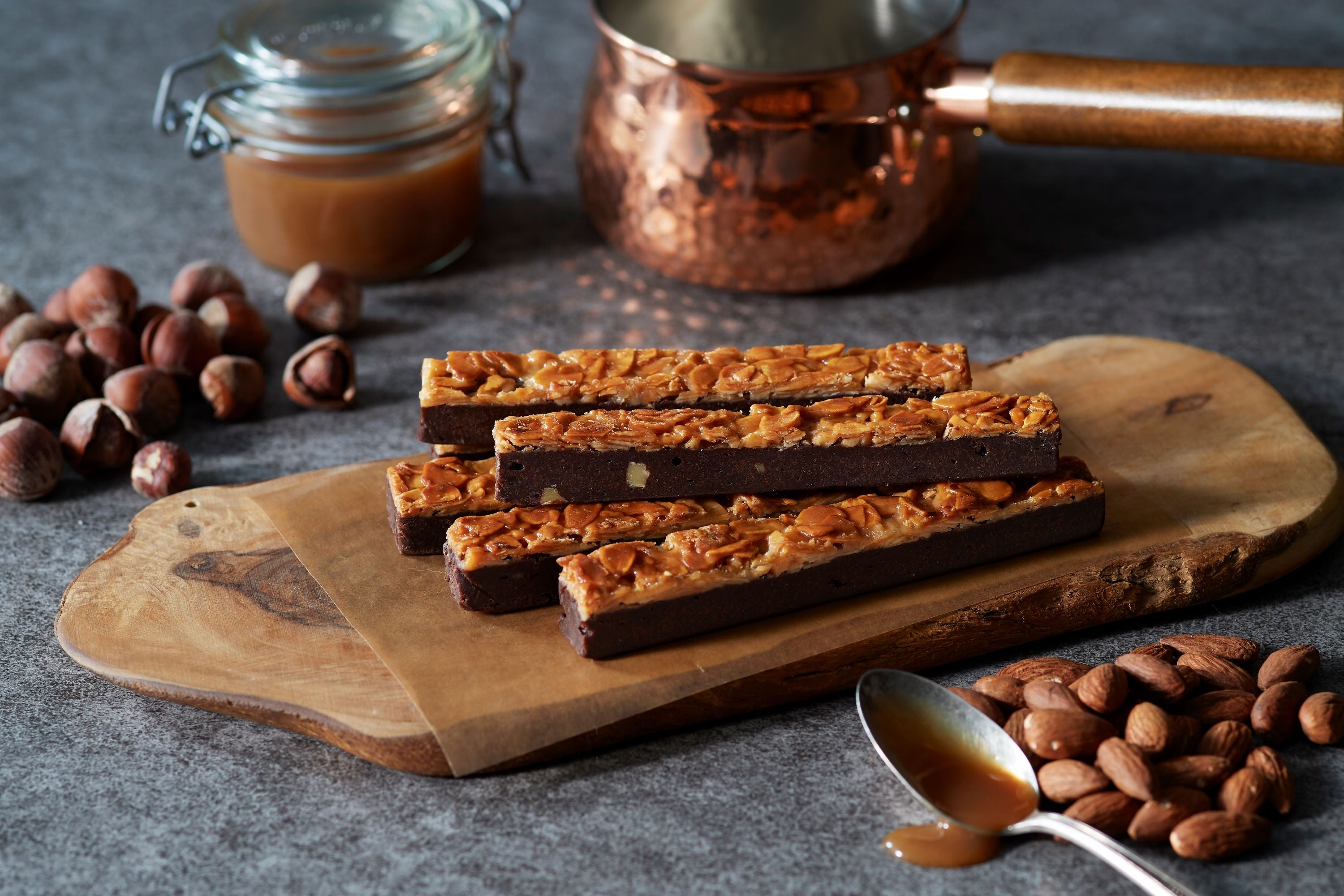 ヘーゼルナッツペーストを混ぜ込んだブラウニー生地の上に、アーモンドとカラメルのヌガーを重ねました。