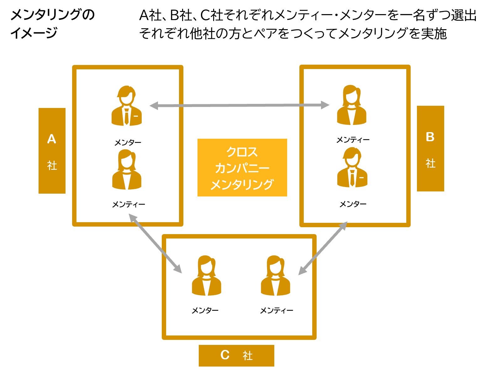 ・参加者要件:参加メンティーは、近い将来経営幹部としての活躍が期待される部長クラスの女性。参加メンターは、各社にて執行役員として活躍されている方(男女問わず)。