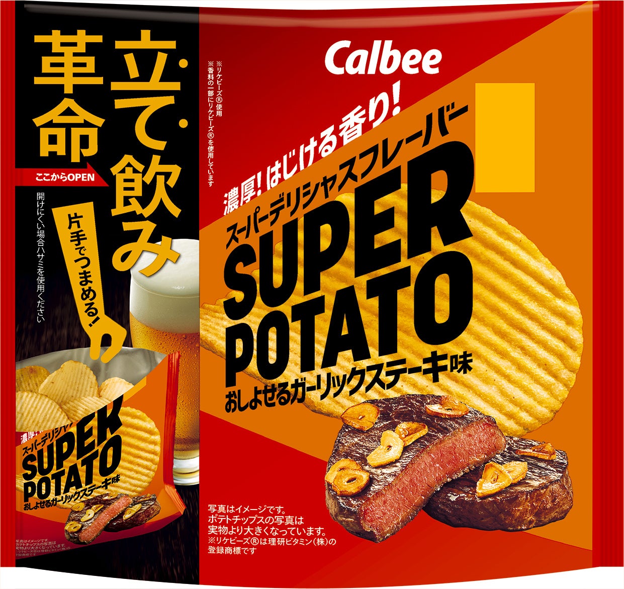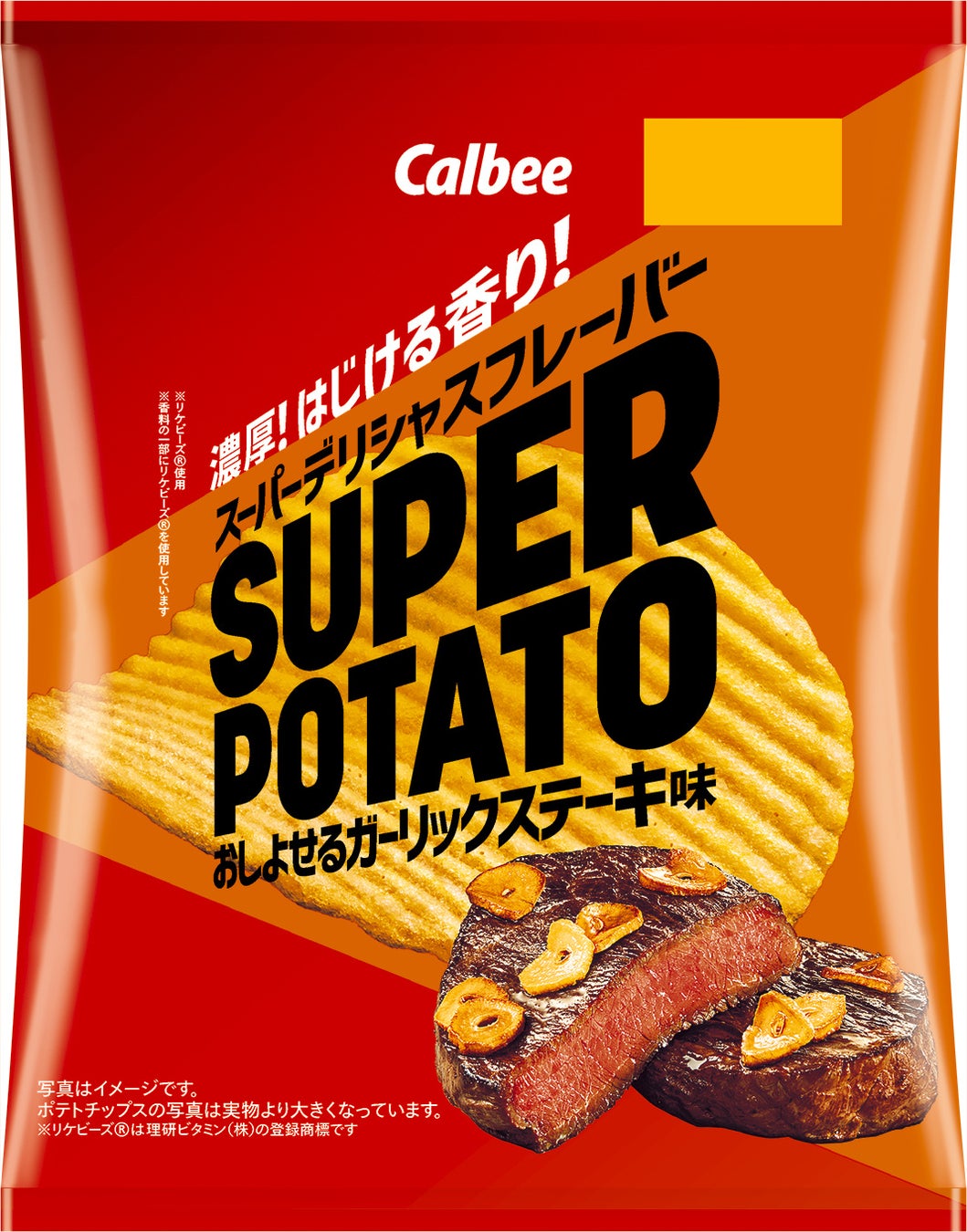厚切りの超濃厚ポテトチップス「スーパーポテト」より新フレーバーが登場!ポテトチップス史上初、新素材「リケビーズ🄬」を使用!肉の旨みがはじける『スーパーポテト おしよせるガーリックステーキ味』