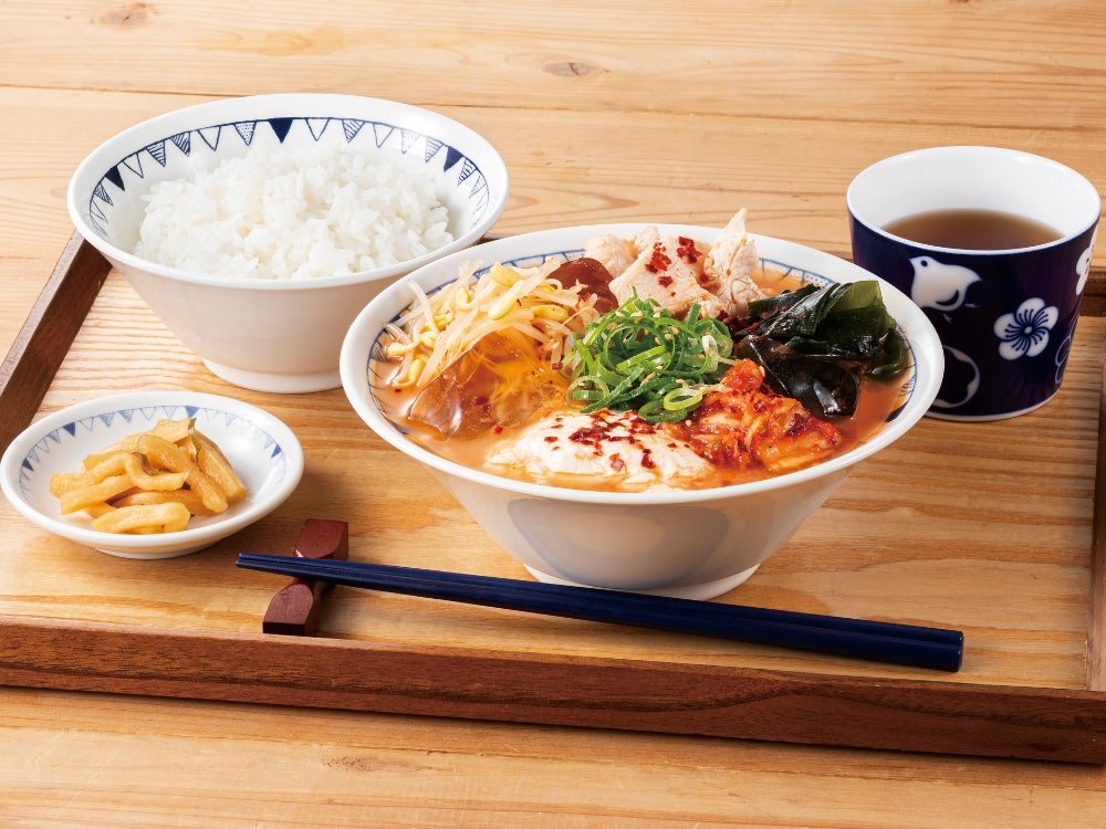 グランドメニューで人気の「辛味噌チゲ豚汁定食」を、暑い日は冷たくひんやりと、ごはんのおかずになる豚汁としてお召し上がりいただきたいと考え誕生した「辛味噌チゲの冷やし豚汁定食」。