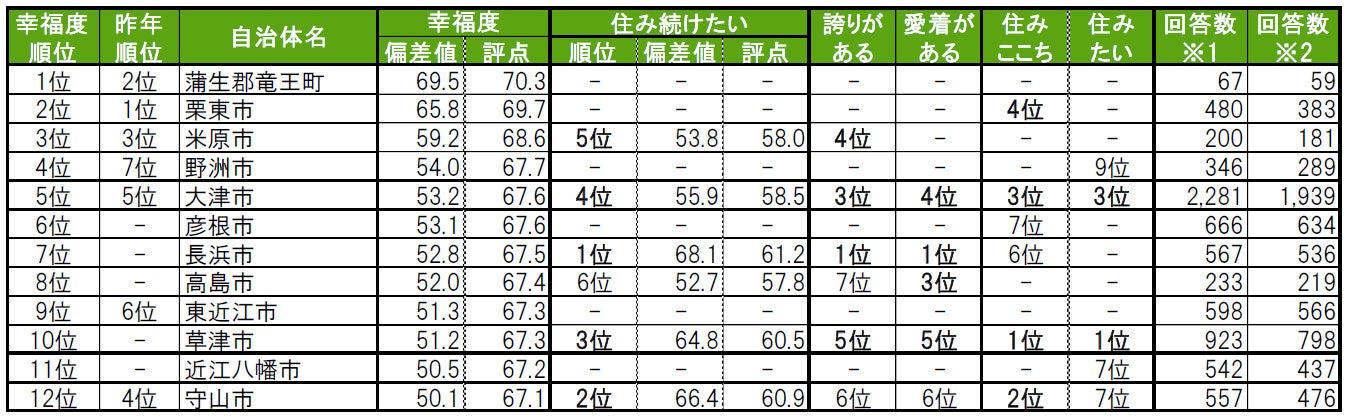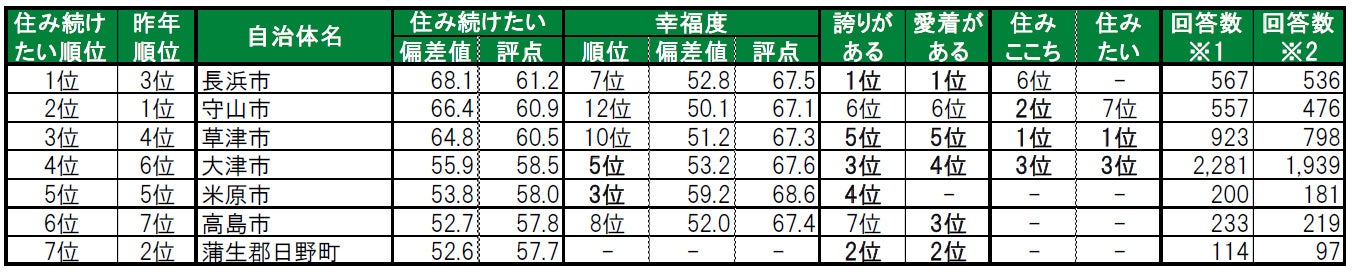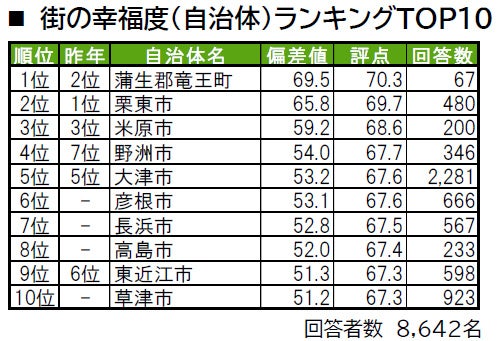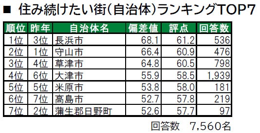 1位は蒲生郡竜王町で、昨年2位から順位を上げました。2位は栗東市で、「住みここち」では4位となっています。3位は3年連続で米原市で、「街に誇りがある」4位、「住み続けたい街」5位となっている街です。