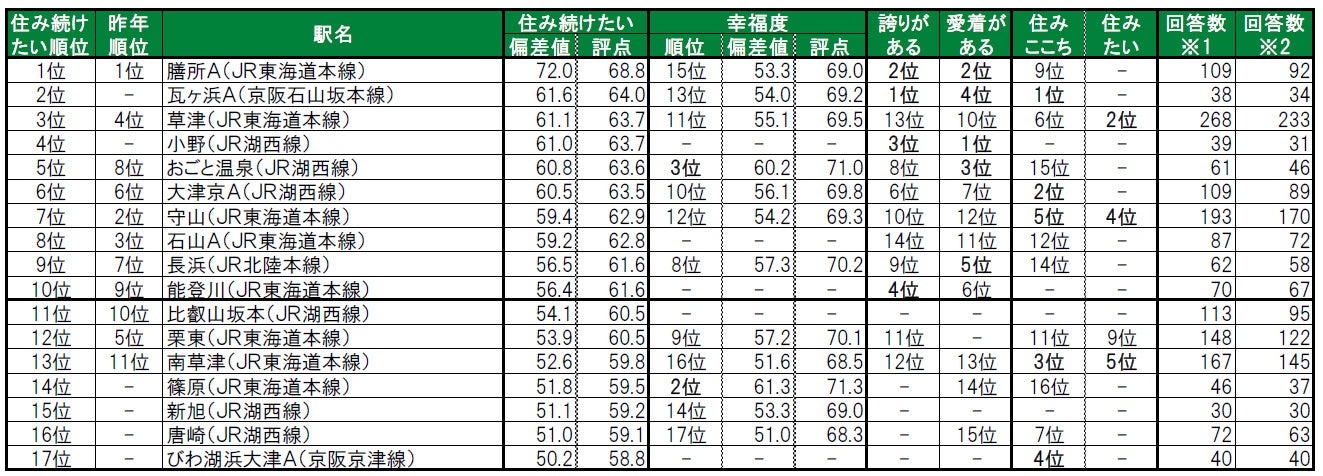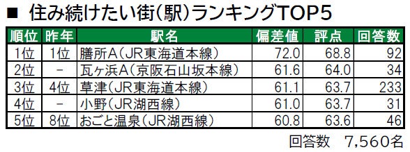 1位は3年連続で、唯一偏差値70台の高い評価を得ている膳所Aで、大津市に位置する駅です。同駅は、「街に誇りがある」「街に愛着がある」の両ランキングでは2位となっています。2位は、大津市に位置する瓦ヶ浜Aで、昨年は累計回答数が30名未満でランキング集計対象外だった駅です。3位は、「住み続けたい街(自治体)」でも3位の草津市に位置する草津で、「住みたい街」では2位となっています。
