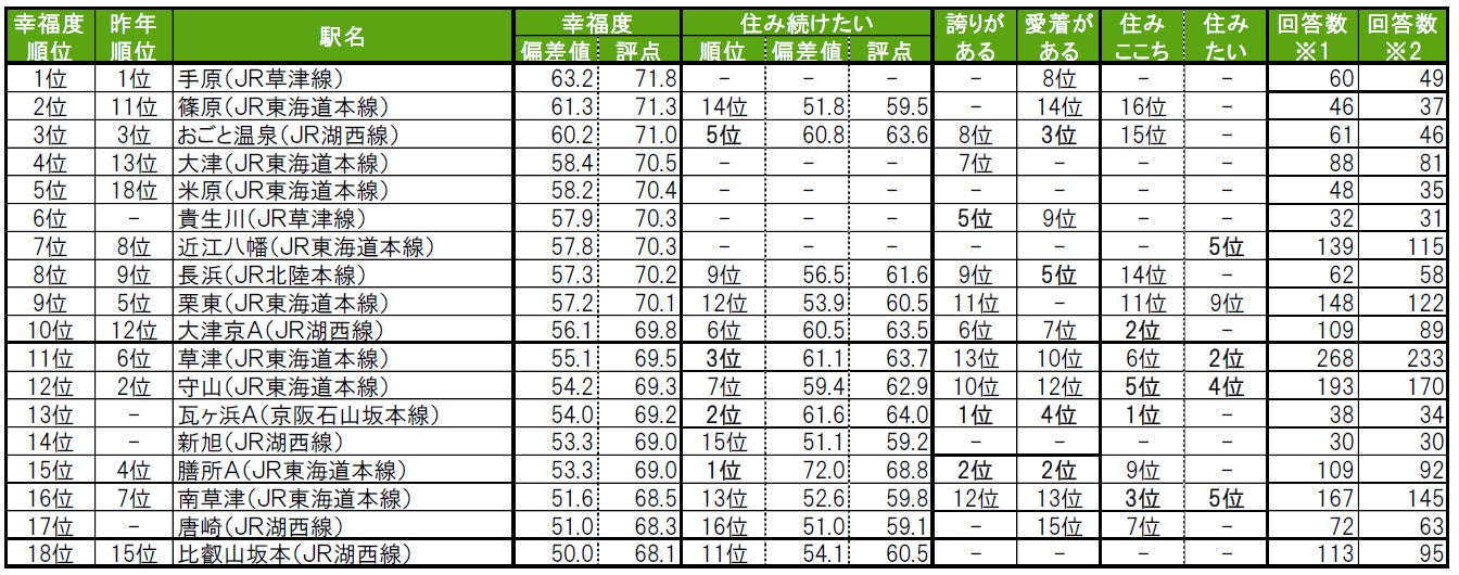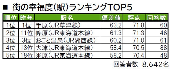 1位は、3年連続で手原で、「街の幸福度(自治体)」で2位の栗東市に位置する駅です。2位は近江八幡市に位置する篠原で、昨年11位から大幅に順位を上げています。3位は2年連続で大津市に位置するおごと温泉で、「街に愛着がある」で3位、「住み続けたい街」で5位となっている駅です。