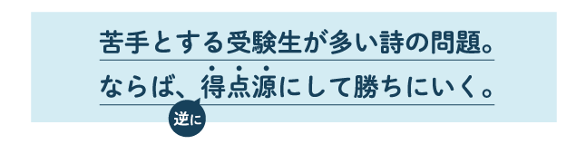 筑駒をめざすなら、だれもが避けては通れない「詩」。直近10年を遡っても、国語の大問として必ず出題されています。そして、「筑駒の詩」の問題は、大人でも頭を抱えるものが多く、それを小学6年生が解く、解かなくてはならない、という現実があります。漫然と演習を繰り返すだけで、本番でたまたま正解できるような、そんな甘いものではありません。